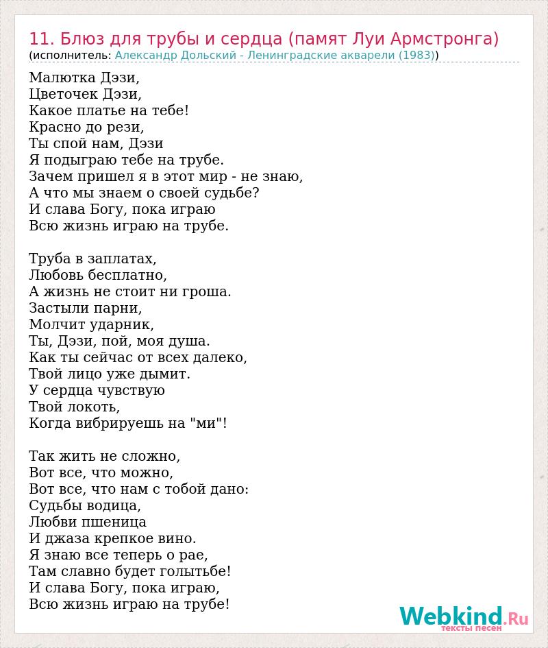 Малютка Дэзи, Цветочек Дэзи, Какое платье на тебе! Красно до рези, Ты спой нам, Дэзи Я подыграю тебе на трубе. Зачем пришел я в этот мир - не знаю, А что мы знаем о своей судьбе? И слава Богу, пока играю Всю жизнь играю на трубе. Труба в заплатах, Любовь бесплатно, А жизнь не стоит ни гроша. Застыли парни, Молчит ударник, Ты, Дэзи, пой, моя душа. Как ты сейчас от всех далеко, Твой лицо уже дымит. У сердца чувствую Твой локоть, Когда вибрируешь на "ми"! Так жить не сложно, Вот все, что можно, Вот все, что нам с тобой дано: Судьбы водица, Любви пшеница И джаза крепкое вино. Я знаю все теперь о рае, Там славно будет голытьбе! И слава Богу, пока играю, Всю жизнь играю на трубе!