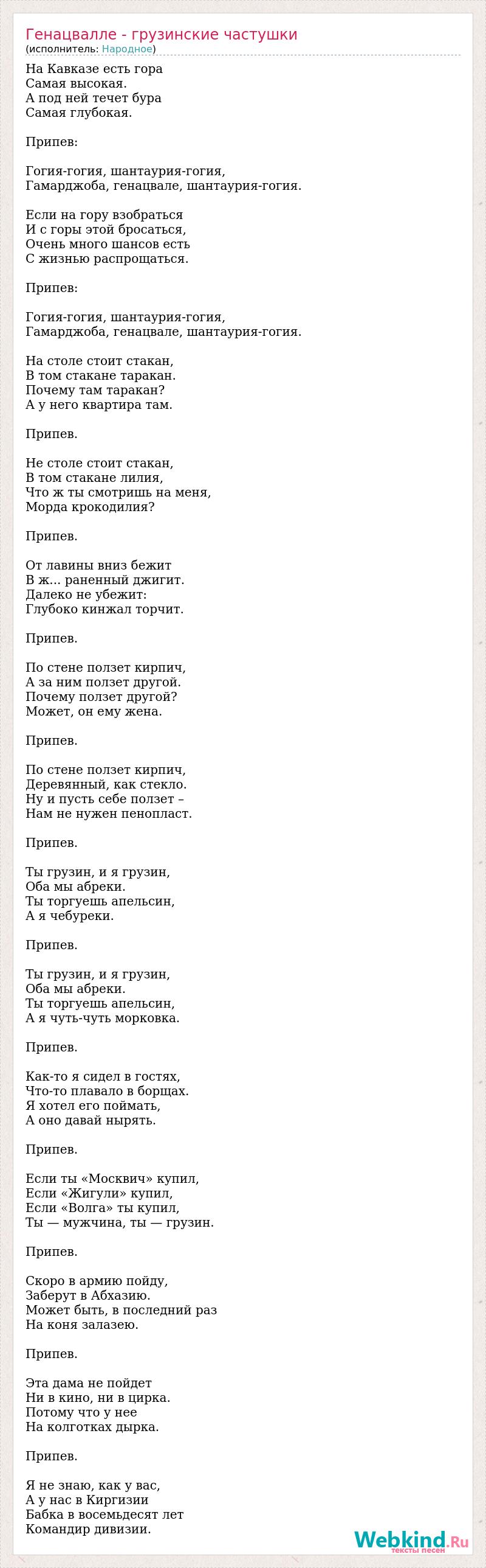 На Кавказе есть гора Самая высокая. А под ней течет бура Самая глубокая. Припев: Гогия-гогия, шантаурия-гогия, Гамарджоба, генацвале, шантаурия-гогия. Если на гору взобраться И с горы этой бросаться, Очень много шансов есть С жизнью распрощаться. Припев: Гогия-гогия, шантаурия-гогия, Гамарджоба, генацвале, шантаурия-гогия. На столе стоит стакан, В том стакане таракан. Почему там таракан? А у него квартира там. Припев. Не столе стоит стакан, В том стакане лилия, Что ж ты смотришь на меня, Морда крокодилия? Припев. От лавины вниз бежит В ж... раненный джигит. Далеко не убежит: Глубоко кинжал торчит. Припев. По стене ползет кирпич, А за ним ползет другой. Почему ползет другой? Может, он ему жена. Припев. По стене ползет кирпич, Деревянный, как стекло. Ну и пусть себе ползет – Нам не нужен пенопласт. Припев. Ты грузин, и я грузин, Оба мы абреки. Ты торгуешь апельсин, А я чебуреки. Припев. Ты грузин, и я грузин, Оба мы абреки. Ты торгуешь апельсин, А я чуть-чуть морковка. Припев. Как-то я сидел в гостях, Что-то плавало в борщах. Я хотел его поймать, А оно давай нырять. Припев. Если ты «Москвич» купил, Если «Жигули» купил, Если «Волга» ты купил, Ты — мужчина, ты — грузин. Припев. Скоро в армию пойду, Заберут в Абхазию. Может быть, в последний раз На коня залазею. Припев. Эта дама не пойдет Ни в кино, ни в цирка. Потому что у нее На колготках дырка. Припев. Я не знаю, как у вас, А у нас в Киргизии Бабка в восемьдесят лет Командир дивизии.