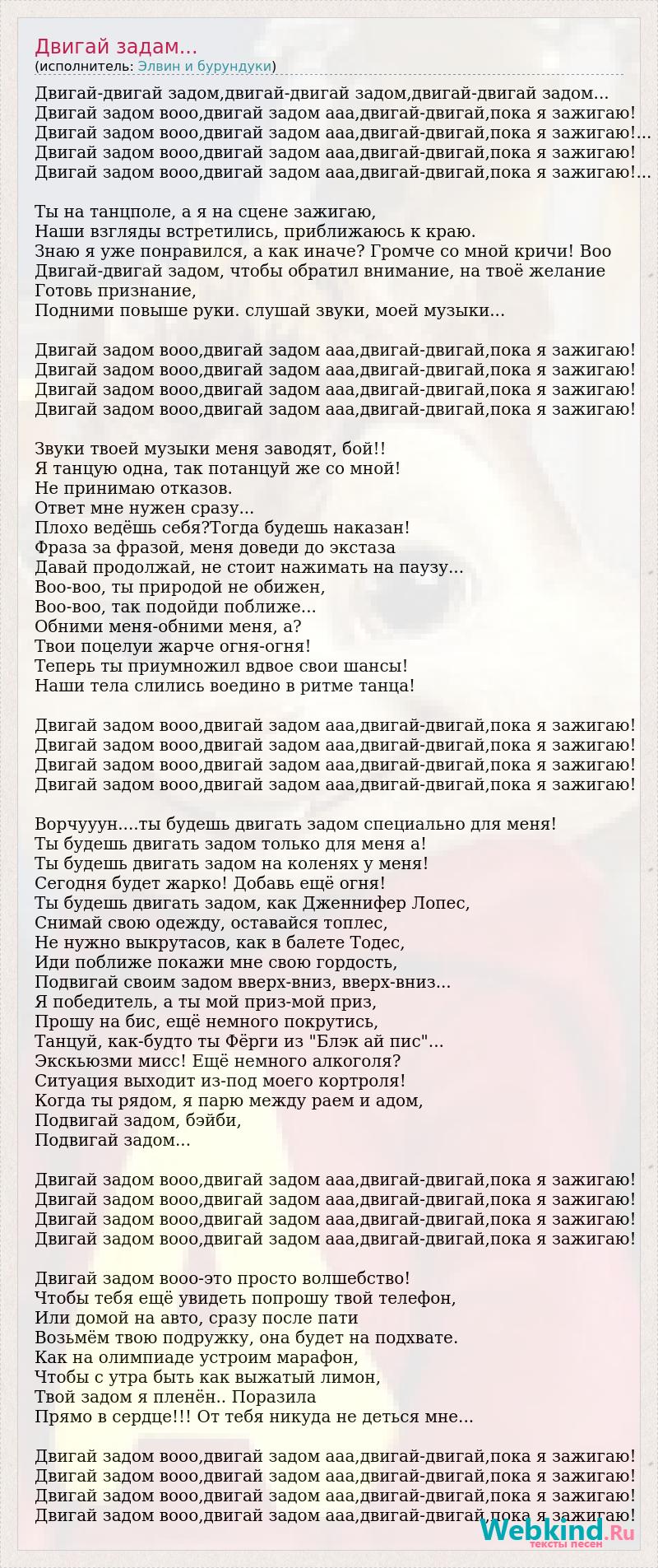 Двигай-двигай задом,двигай-двигай задом,двигай-двигай задом... Двигай задом вооо,двигай задом ааа,двигай-двигай,пока я зажигаю! Двигай задом вооо,двигай задом ааа,двигай-двигай,пока я зажигаю!... Двигай задом вооо,двигай задом ааа,двигай-двигай,пока я зажигаю! Двигай задом вооо,двигай задом ааа,двигай-двигай,пока я зажигаю!... Ты на танцполе, а я на сцене зажигаю, Наши взгляды встретились, приближаюсь к краю. Знаю я уже понравился, а как иначе? Громче со мной кричи! Воо Двигай-двигай задом, чтобы обратил внимание, на твоё желание Готовь признание, Подними повыше руки. слушай звуки, моей музыки... Двигай задом вооо,двигай задом ааа,двигай-двигай,пока я зажигаю! Двигай задом вооо,двигай задом ааа,двигай-двигай,пока я зажигаю! Двигай задом вооо,двигай задом ааа,двигай-двигай,пока я зажигаю! Двигай задом вооо,двигай задом ааа,двигай-двигай,пока я зажигаю! Звуки твоей музыки меня заводят, бой!! Я танцую одна, так потанцуй же со мной! Не принимаю отказов. Ответ мне нужен сразу... Плохо ведёшь себя?Тогда будешь наказан! Фраза за фразой, меня доведи до экстаза Давай продолжай, не стоит нажимать на паузу... Воо-воо, ты природой не обижен, Воо-воо, так подойди поближе... Обними меня-обними меня, а? Твои поцелуи жарче огня-огня! Теперь ты приумножил вдвое свои шансы! Наши тела слились воедино в ритме танца! Двигай задом вооо,двигай задом ааа,двигай-двигай,пока я зажигаю! Двигай задом вооо,двигай задом ааа,двигай-двигай,пока я зажигаю! Двигай задом вооо,двигай задом ааа,двигай-двигай,пока я зажигаю! Двигай задом вооо,двигай задом ааа,двигай-двигай,пока я зажигаю! Ворчууун....ты будешь двигать задом специально для меня! Ты будешь двигать задом только для меня а! Ты будешь двигать задом на коленях у меня! Сегодня будет жарко! Добавь ещё огня! Ты будешь двигать задом, как Дженнифер Лопес, Снимай свою одежду, оставайся топлес, Не нужно выкрутасов, как в балете Тодес, Иди поближе покажи мне свою гордость, Подвигай своим задом вверх-вниз, вверх-вниз... Я победитель, а ты мой приз-мой приз, Прошу на бис, ещё немного покрутись, Танцуй, как-будто ты Фёрги из "Блэк ай пис"... Экскьюзми мисс! Ещё немного алкоголя? Ситуация выходит из-под моего кортроля! Когда ты рядом, я парю между раем и адом, Подвигай задом, бэйби, Подвигай задом... Двигай задом вооо,двигай задом ааа,двигай-двигай,пока я зажигаю! Двигай задом вооо,двигай задом ааа,двигай-двигай,пока я зажигаю! Двигай задом вооо,двигай задом ааа,двигай-двигай,пока я зажигаю! Двигай задом вооо,двигай задом ааа,двигай-двигай,пока я зажигаю! Двигай задом вооо-это просто волшебство! Чтобы тебя ещё увидеть попрошу твой телефон, Или домой на авто, сразу после пати Возьмём твою подружку, она будет на подхвате. Как на олимпиаде устроим марафон, Чтобы с утра быть как выжатый лимон, Твой задом я пленён.. Поразила Прямо в сердце!!! От тебя никуда не деться мне... Двигай задом вооо,двигай задом ааа,двигай-двигай,пока я зажигаю! Двигай задом вооо,двигай задом ааа,двигай-двигай,пока я зажигаю! Двигай задом вооо,двигай задом ааа,двигай-двигай,пока я зажигаю! Двигай задом вооо,двигай задом ааа,двигай-двигай,пока я зажигаю!