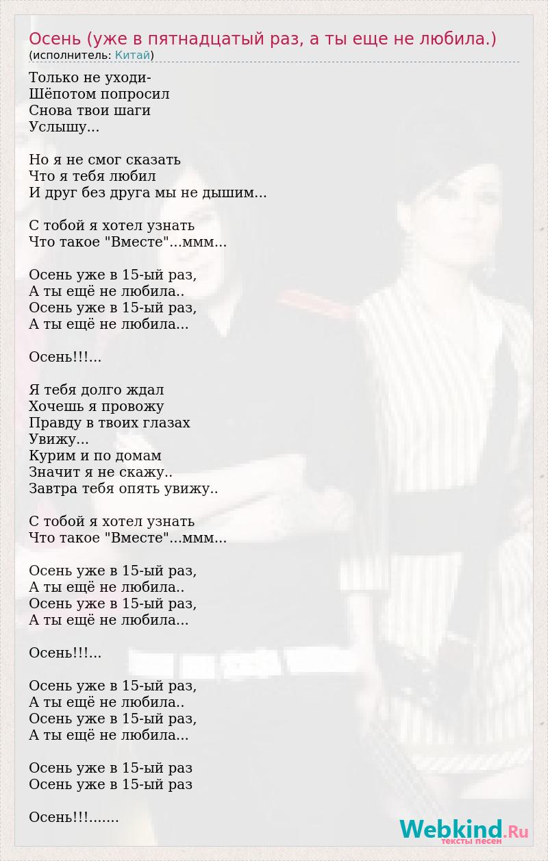 Только не уходи- Шёпотом попросил Снова твои шаги Услышу... Но я не смог сказать Что я тебя любил И друг без друга мы не дышим... С тобой я хотел узнать Что такое "Вместе"...ммм... Осень уже в 15-ый раз, А ты ещё не любила.. Осень уже в 15-ый раз, А ты ещё не любила... Осень!!!... Я тебя долго ждал Хочешь я провожу Правду в твоих глазах Увижу... Курим и по домам Значит я не скажу.. Завтра тебя опять увижу.. С тобой я хотел узнать Что такое "Вместе"...ммм... Осень уже в 15-ый раз, А ты ещё не любила.. Осень уже в 15-ый раз, А ты ещё не любила... Осень!!!... Осень уже в 15-ый раз, А ты ещё не любила.. Осень уже в 15-ый раз, А ты ещё не любила... Осень уже в 15-ый раз Осень уже в 15-ый раз Осень!!!.......