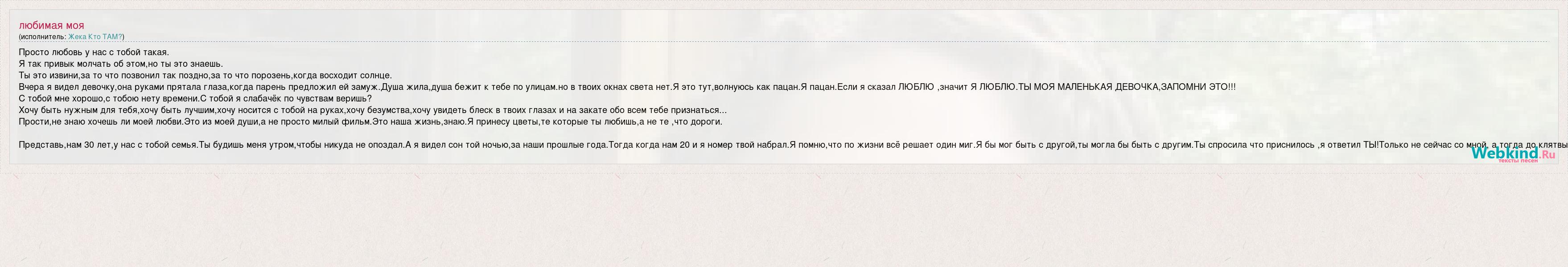 Просто любовь у нас с тобой такая. Я так привык молчать об этом,но ты это знаешь. Ты это извини,за то что позвонил так поздно,за то что порозень,когда восходит солнце. Вчера я видел девочку,она руками прятала глаза,когда парень предложил ей замуж.Душа жила,душа бежит к тебе по улицам.но в твоих окнах света нет.Я это тут,волнуюсь как пацан.Я пацан.Если я сказал ЛЮБЛЮ ,значит Я ЛЮБЛЮ.ТЫ МОЯ МАЛЕНЬКАЯ ДЕВОЧКА,ЗАПОМНИ ЭТО!!! С тобой мне хорошо,с тобою нету времени.С тобой я слабачёк по чувствам веришь? Хочу быть нужным для тебя,хочу быть лучшим,хочу носится с тобой на руках,хочу безумства,хочу увидеть блеск в твоих глазах и на закате обо всем тебе признаться... Прости,не знаю хочешь ли моей любви.Это из моей души,а не просто милый фильм.Это наша жизнь,знаю.Я принесу цветы,те которые ты любишь,а не те ,что дороги. Представь,нам 30 лет,у нас с тобой семья.Ты будишь меня утром,чтобы никуда не опоздал.А я видел сон той ночью,за наши прошлые года.Тогда когда нам 20 и я номер твой набрал.Я помню,что по жизни всё решает один миг.Я бы мог быть с другой,ты могла бы быть с другим.Ты спросила что приснилось ,я ответил ТЫ!Только не сейчас со мной, а тогда до клятвы