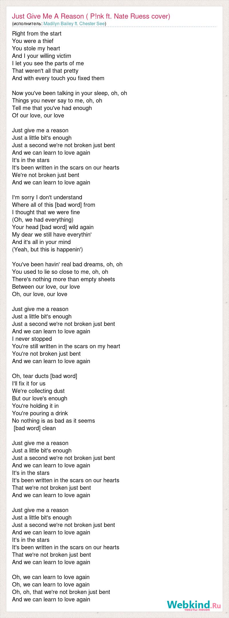 Right from the start You were a thief You stole my heart And I your willing victim I let you see the parts of me That weren't all that pretty And with every touch you fixed them Now you've been talking in your sleep, oh, oh Things you never say to me, oh, oh Tell me that you've had enough Of our love, our love Just give me a reason Just a little bit's enough Just a second we're not broken just bent And we can learn to love again It's in the stars It's been written in the scars on our hearts We're not broken just bent And we can learn to love again I'm sorry I don't understand Where all of this [bad word] from I thought that we were fine (Oh, we had everything) Your head [bad word] wild again My dear we still have everythin' And it's all in your mind (Yeah, but this is happenin') You've been havin' real bad dreams, oh, oh You used to lie so close to me, oh, oh There's nothing more than empty sheets Between our love, our love Oh, our love, our love Just give me a reason Just a little bit's enough Just a second we're not broken just bent And we can learn to love again I never stopped You're still written in the scars on my heart You're not broken just bent And we can learn to love again Oh, tear ducts [bad word] I'll fix it for us We're collecting dust But our love's enough You're holding it in You're pouring a drink No nothing is as bad as it seems [bad word] clean Just give me a reason Just a little bit's enough Just a second we're not broken just bent And we can learn to love again It's in the stars It's been written in the scars on our hearts That we're not broken just bent And we can learn to love again Just give me a reason Just a little bit's enough Just a second we're not broken just bent And we can learn to love again It's in the stars It's been written in the scars on our hearts That we're not broken just bent And we can learn to love again Oh, we can learn to love again Oh, we can learn to love again Oh, oh, that we're not broken just bent And we can learn to love again