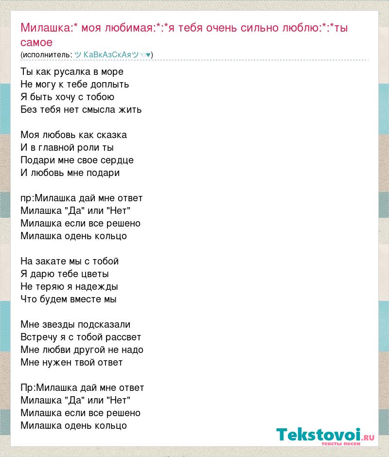 Ты как русалка в море Не могу к тебе доплыть Я быть хочу с тобою Без тебя нет смысла жить Моя любовь как сказка И в главной роли ты Подари мне свое сердце И любовь мне подари пр:Милашка дай мне ответ Милашка "Да" или "Нет" Милашка если все решено Милашка одень кольцо На закате мы с тобой Я дарю тебе цветы Не теряю я надежды Что будем вместе мы Мне звезды подсказали Встречу я с тобой рассвет Мне любви другой не надо Мне нужен твой ответ Пр:Милашка дай мне ответ Милашка "Да" или "Нет" Милашка если все решено Милашка одень кольцо