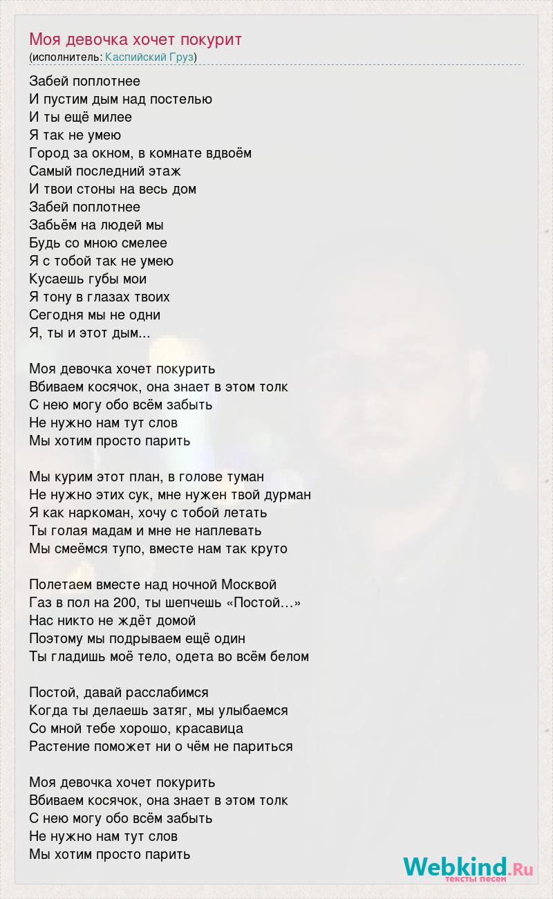 Забей поплотнее И пустим дым над постелью И ты ещё милее Я так не умею Город за окном, в комнате вдвоём Самый последний этаж И твои стоны на весь дом Забей поплотнее Забьём на людей мы Будь со мною смелее Я с тобой так не умею Кусаешь губы мои Я тону в глазах твоих Сегодня мы не одни Я, ты и этот дым... Моя девочка хочет покурить Вбиваем косячок, она знает в этом толк С нею могу обо всём забыть Не нужно нам тут слов Мы хотим просто парить Мы курим этот план, в голове туман Не нужно этих сук, мне нужен твой дурман Я как наркоман, хочу с тобой летать Ты голая мадам и мне не наплевать Мы смеёмся тупо, вместе нам так круто Полетаем вместе над ночной Москвой Газ в пол на 200, ты шепчешь «Постой…» Нас никто не ждёт домой Поэтому мы подрываем ещё один Ты гладишь моё тело, одета во всём белом Постой, давай расслабимся Когда ты делаешь затяг, мы улыбаемся Со мной тебе хорошо, красавица Растение поможет ни о чём не париться Моя девочка хочет покурить Вбиваем косячок, она знает в этом толк С нею могу обо всём забыть Не нужно нам тут слов Мы хотим просто парить