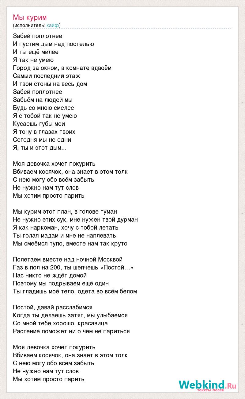 Забей поплотнее И пустим дым над постелью И ты ещё милее Я так не умею Город за окном, в комнате вдвоём Самый последний этаж И твои стоны на весь дом Забей поплотнее Забьём на людей мы Будь со мною смелее Я с тобой так не умею Кусаешь губы мои Я тону в глазах твоих Сегодня мы не одни Я, ты и этот дым... Моя девочка хочет покурить Вбиваем косячок, она знает в этом толк С нею могу обо всём забыть Не нужно нам тут слов Мы хотим просто парить Мы курим этот план, в голове туман Не нужно этих сук, мне нужен твой дурман Я как наркоман, хочу с тобой летать Ты голая мадам и мне не наплевать Мы смеёмся тупо, вместе нам так круто Полетаем вместе над ночной Москвой Газ в пол на 200, ты шепчешь «Постой…» Нас никто не ждёт домой Поэтому мы подрываем ещё один Ты гладишь моё тело, одета во всём белом Постой, давай расслабимся Когда ты делаешь затяг, мы улыбаемся Со мной тебе хорошо, красавица Растение поможет ни о чём не париться Моя девочка хочет покурить Вбиваем косячок, она знает в этом толк С нею могу обо всём забыть Не нужно нам тут слов Мы хотим просто парить