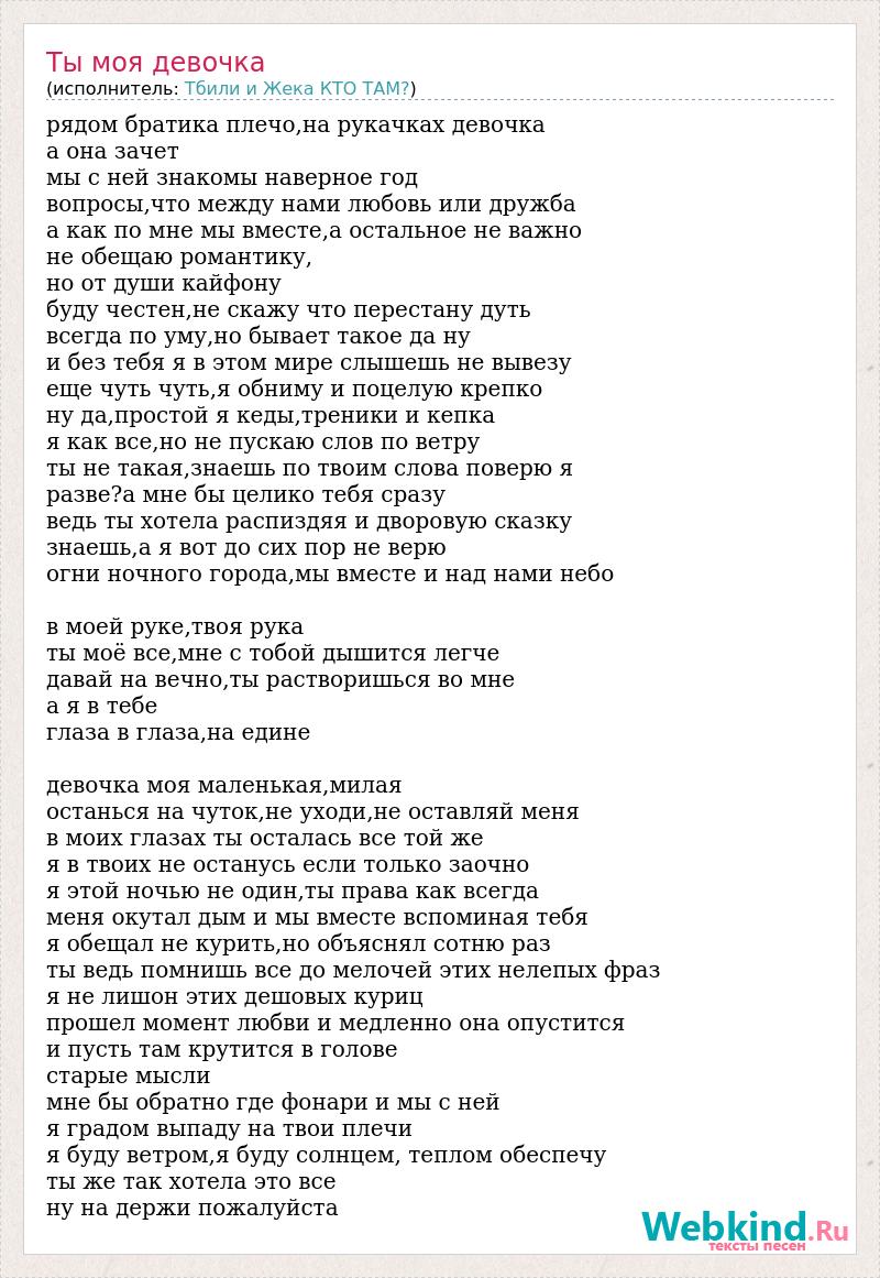рядом братика плечо,на рукачках девочка а она зачет мы с ней знакомы наверное год вопросы,что между нами любовь или дружба а как по мне мы вместе,а остальное не важно не обещаю романтику, но от души кайфону буду честен,не скажу что перестану дуть всегда по уму,но бывает такое да ну и без тебя я в этом мире слышешь не вывезу еще чуть чуть,я обниму и поцелую крепко ну да,простой я кеды,треники и кепка я как все,но не пускаю слов по ветру ты не такая,знаешь по твоим слова поверю я разве?а мне бы целико тебя сразу ведь ты хотела распиздяя и дворовую сказку знаешь,а я вот до сих пор не верю огни ночного города,мы вместе и над нами небо в моей руке,твоя рука ты моё все,мне с тобой дышится легче давай на вечно,ты растворишься во мне а я в тебе глаза в глаза,на едине девочка моя маленькая,милая останься на чуток,не уходи,не оставляй меня в моих глазах ты осталась все той же я в твоих не останусь если только заочно я этой ночью не один,ты права как всегда меня окутал дым и мы вместе вспоминая тебя я обещал не курить,но объяснял сотню раз ты ведь помнишь все до мелочей этих нелепых фраз я не лишон этих дешовых куриц прошел момент любви и медленно она опустится и пусть там крутится в голове старые мысли мне бы обратно где фонари и мы с ней я градом выпаду на твои плечи я буду ветром,я буду солнцем, теплом обеспечу ты же так хотела это все ну на держи пожалуйста