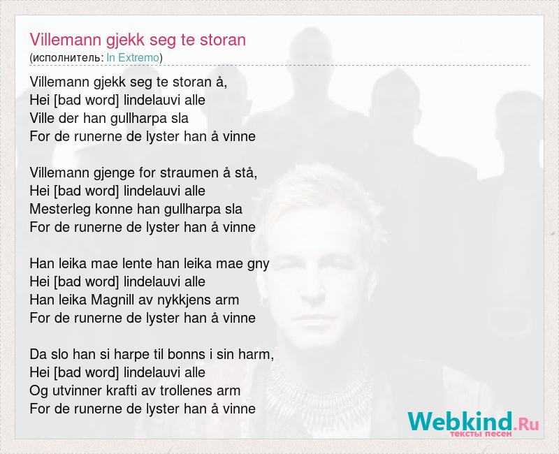 Villemann gjekk seg te storan å, Hei [bad word] lindelauvi alle Ville der han gullharpa sla For de runerne de lyster han å vinne Villemann gjenge for straumen å stå, Hei [bad word] lindelauvi alle Mesterleg konne han gullharpa sla For de runerne de lyster han å vinne Han leika mae lente han leika mae gny Hei [bad word] lindelauvi alle Han leika Magnill av nykkjens arm For de runerne de lyster han å vinne Da slo han si harpe til bonns i sin harm, Hei [bad word] lindelauvi alle Og utvinner krafti av trollenes arm For de runerne de lyster han å vinne