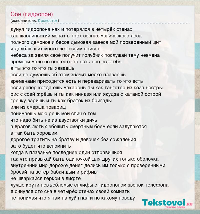дунул гидропона нах и потерялся в четырёх стенах как шаолиньский монах в трёх соснах магического леса полного демонов и бесов дымовая завеса мой проверенный щит я долблю шит много лет своим привет небеса за земля своё получит голубчик послушай тему невмена времени мало но оно есть то есть оно ест тебя а ты это то что ты хаваешь если не думаешь об этом значит мелко плаваешь временами приходится есть и переваривать то что есть если рэпер когда ешь макароны ты как гангстер из коза ностры рис с соей жрёшь и ты как ниндзя или якудза с катаной острой гречку варишь и ты как браток из бригады или из смерша товарищ понимаешь мою речь мой спич о том что надо бить не из двустволки дичь а врагов лютых ебошить смертным боем если залупаются а так быть хорошим дорогое тратить на братву и девочек без сожаления зато будет что вспомнить когда в плаванье последнее один отправишься так что привыкай быть одиночкой для других только оболочка внутренний мир дороже денег делись им только с проверенными бросай на ветер бабки дым и рифмы не шваркайся геркой в лифте лучше крути невъеблемые сплифы с гидропоном звонок телефона я очнулся ото сна в четырёх стенах своей комнаты не понимая что я там на хуй гнал и по какому поводу