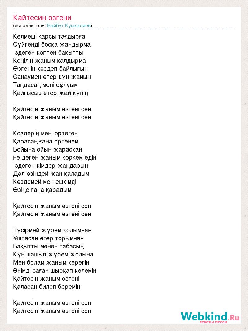 Келмеші қарсы тағдырға Сүйгенді босқа жандырма Іздеген көптен бақытты Көңілін жаным қалдырма Өзгенің көздеп байлығын Санаумен өтер күн жайын Таңдасаң мені сұлуым Қайғысыз өтер жай күнің Қайтесің жаным өзгені сен Қайтесің жаным өзгені сен Көздерің мені өртеген Қарасаң ғана өртенем Бойына ойын жарасқан не деген жаным көркем едің Іздеген кімдер жандарын Дәл өзіндей жан қаладым Көздемей мен ешкімді Өзіңе ғана қарадым Қайтесің жаным өзгені сен Қайтесің жаным өзгені сен Түсірмей жүрем қолымнан Ұшпасаң егер торымнан Бақытты менен табасың Күн шашып жүрем жолына Мен болам жаным керегін Әнімді саған шырқап келемін Қайтесің жаным өзгені Қаласаң билеп беремін Қайтесің жаным өзгені сен Қайтесің жаным өзгені сен