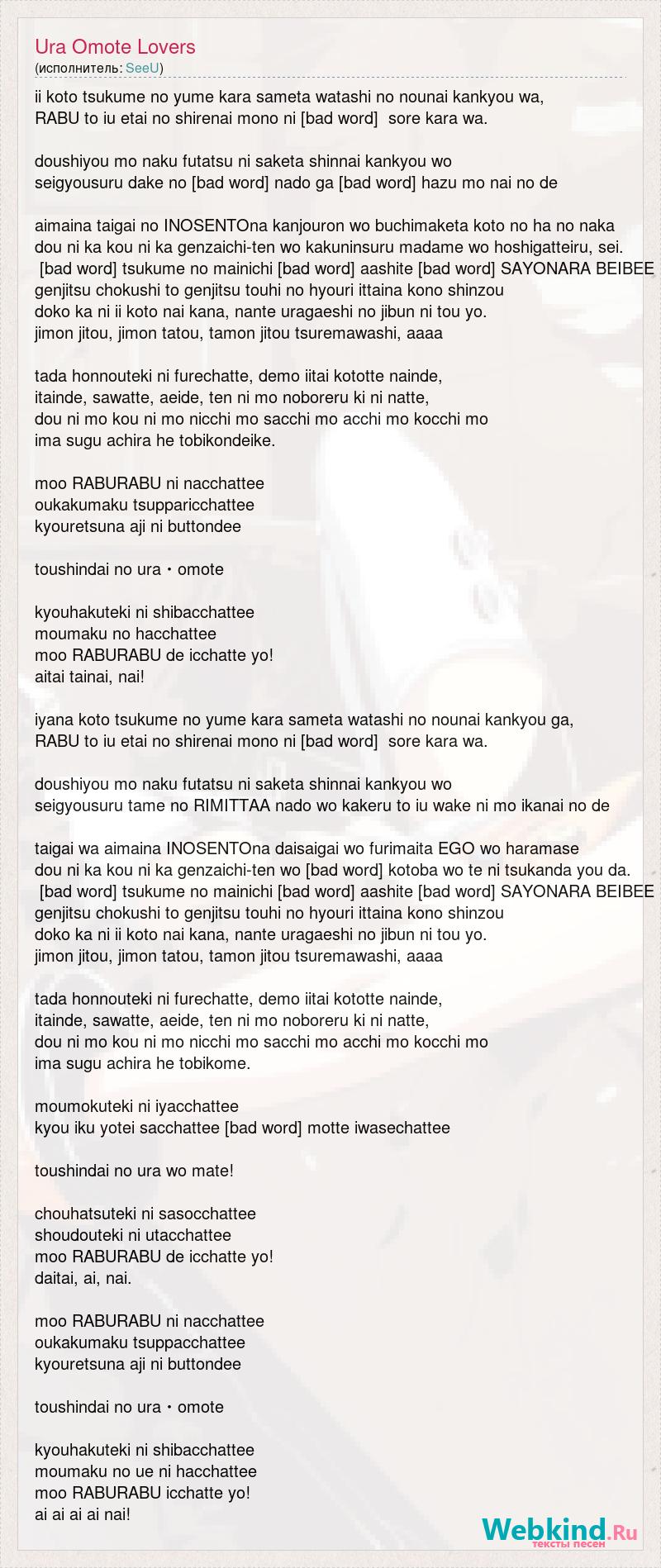 ii koto tsukume no yume kara sameta watashi no nounai kankyou wa, RABU to iu etai no shirenai mono ni [bad word] sore kara wa. doushiyou mo naku futatsu ni saketa shinnai kankyou wo seigyousuru dake no [bad word] nado ga [bad word] hazu mo nai no de aimaina taigai no INOSENTOna kanjouron wo buchimaketa koto no ha no naka dou ni ka kou ni ka genzaichi-ten wo kakuninsuru madame wo hoshigatteiru, sei. [bad word] tsukume no mainichi [bad word] aashite [bad word] SAYONARA BEIBEE genjitsu chokushi to genjitsu touhi no hyouri ittaina kono shinzou doko ka ni ii koto nai kana, nante uragaeshi no jibun ni tou yo. jimon jitou, jimon tatou, tamon jitou tsuremawashi, aaaa tada honnouteki ni furechatte, demo iitai kototte nainde, itainde, sawatte, aeide, ten ni mo noboreru ki ni natte, dou ni mo kou ni mo nicchi mo sacchi mo acchi mo kocchi mo ima sugu achira he tobikondeike. moo RABURABU ni nacchattee oukakumaku tsupparicchattee kyouretsuna aji ni buttondee toushindai no ura・omote kyouhakuteki ni shibacchattee moumaku no hacchattee moo RABURABU de icchatte yo! aitai tainai, nai! iyana koto tsukume no yume kara sameta watashi no nounai kankyou ga, RABU to iu etai no shirenai mono ni [bad word] sore kara wa. doushiyou mo naku futatsu ni saketa shinnai kankyou wo seigyousuru tame no RIMITTAA nado wo kakeru to iu wake ni mo ikanai no de taigai wa aimaina INOSENTOna daisaigai wo furimaita EGO wo haramase dou ni ka kou ni ka genzaichi-ten wo [bad word] kotoba wo te ni tsukanda you da. [bad word] tsukume no mainichi [bad word] aashite [bad word] SAYONARA BEIBEE genjitsu chokushi to genjitsu touhi no hyouri ittaina kono shinzou doko ka ni ii koto nai kana, nante uragaeshi no jibun ni tou yo. jimon jitou, jimon tatou, tamon jitou tsuremawashi, aaaa tada honnouteki ni furechatte, demo iitai kototte nainde, itainde, sawatte, aeide, ten ni mo noboreru ki ni natte, dou ni mo kou ni mo nicchi mo sacchi mo acchi mo kocchi mo ima sugu achira he tobikome. moumokuteki ni iyacchattee kyou iku yotei sacchattee [bad word] motte iwasechattee toushindai no ura wo mate! chouhatsuteki ni sasocchattee shoudouteki ni utacchattee moo RABURABU de icchatte yo! daitai, ai, nai. moo RABURABU ni nacchattee oukakumaku tsuppacchattee kyouretsuna aji ni buttondee toushindai no ura・omote kyouhakuteki ni shibacchattee moumaku no ue ni hacchattee moo RABURABU icchatte yo! ai ai ai ai nai!