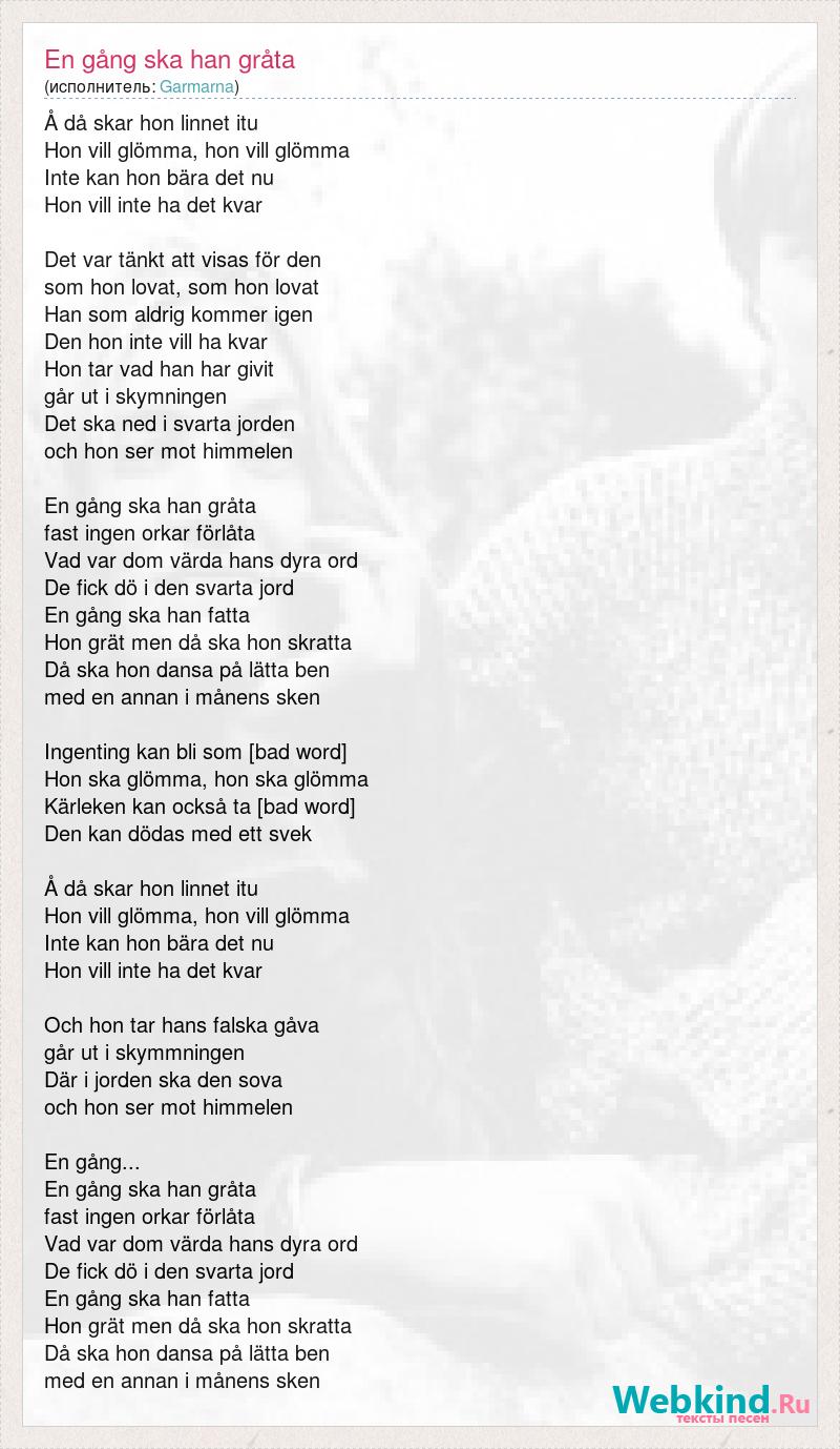 Å då skar hon linnet itu Hon vill glömma, hon vill glömma Inte kan hon bära det nu Hon vill inte ha det kvar Det var tänkt att visas för den som hon lovat, som hon lovat Han som aldrig kommer igen Den hon inte vill ha kvar Hon tar vad han har givit går ut i skymningen Det ska ned i svarta jorden och hon ser mot himmelen En gång ska han gråta fast ingen orkar förlåta Vad var dom värda hans dyra ord De fick dö i den svarta jord En gång ska han fatta Hon grät men då ska hon skratta Då ska hon dansa på lätta ben med en annan i månens sken Ingenting kan bli som [bad word] Hon ska glömma, hon ska glömma Kärleken kan också ta [bad word] Den kan dödas med ett svek Å då skar hon linnet itu Hon vill glömma, hon vill glömma Inte kan hon bära det nu Hon vill inte ha det kvar Och hon tar hans falska gåva går ut i skymmningen Där i jorden ska den sova och hon ser mot himmelen En gång... En gång ska han gråta fast ingen orkar förlåta Vad var dom värda hans dyra ord De fick dö i den svarta jord En gång ska han fatta Hon grät men då ska hon skratta Då ska hon dansa på lätta ben med en annan i månens sken