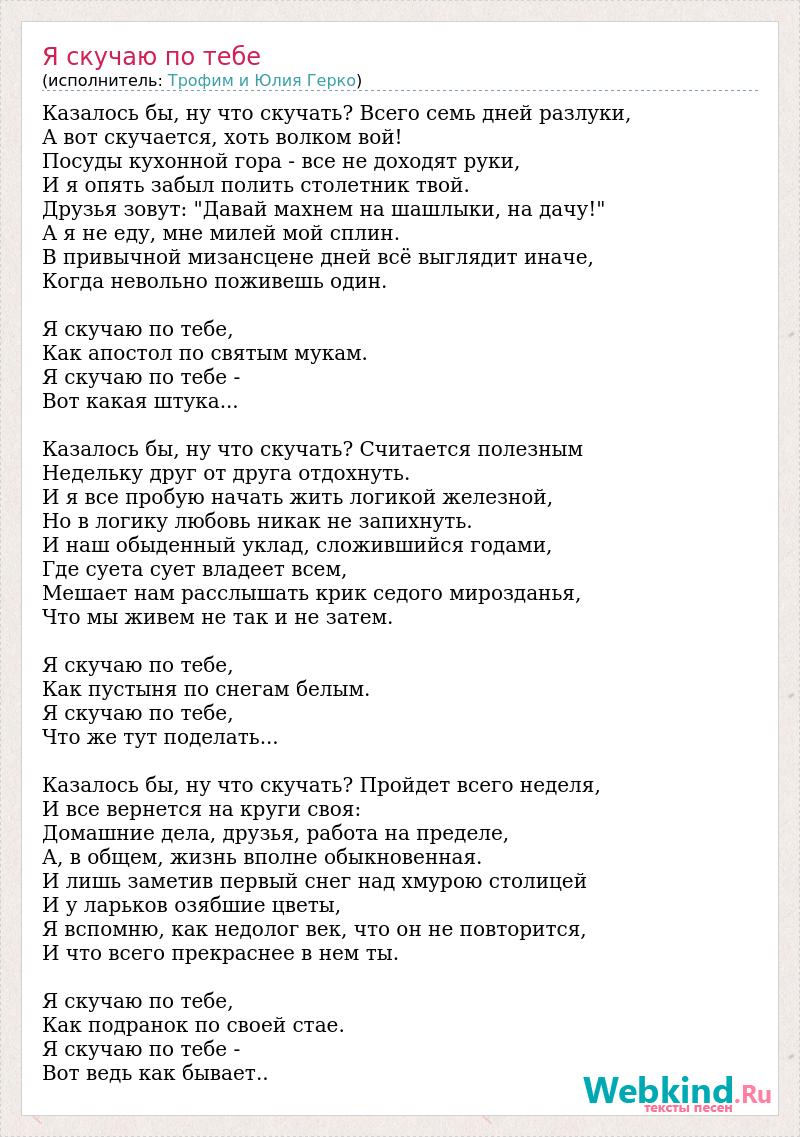 Казалось бы, ну что скучать? Всего семь дней разлуки, А вот скучается, хоть волком вой! Посуды кухонной гора - все не доходят руки, И я опять забыл полить столетник твой. Друзья зовут: "Давай махнем на шашлыки, на дачу!" А я не еду, мне милей мой сплин. В привычной мизансцене дней всё выглядит иначе, Когда невольно поживешь один. Я скучаю по тебе, Как апостол по святым мукам. Я скучаю по тебе - Вот какая штука... Казалось бы, ну что скучать? Считается полезным Недельку друг от друга отдохнуть. И я все пробую начать жить логикой железной, Но в логику любовь никак не запихнуть. И наш обыденный уклад, сложившийся годами, Где суета сует владеет всем, Мешает нам расслышать крик седого мирозданья, Что мы живем не так и не затем. Я скучаю по тебе, Как пустыня по снегам белым. Я скучаю по тебе, Что же тут поделать... Казалось бы, ну что скучать? Пройдет всего неделя, И все вернется на круги своя: Домашние дела, друзья, работа на пределе, А, в общем, жизнь вполне обыкновенная. И лишь заметив первый снег над хмурою столицей И у ларьков озябшие цветы, Я вспомню, как недолог век, что он не повторится, И что всего прекраснее в нем ты. Я скучаю по тебе, Как подранок по своей стае. Я скучаю по тебе - Вот ведь как бывает..