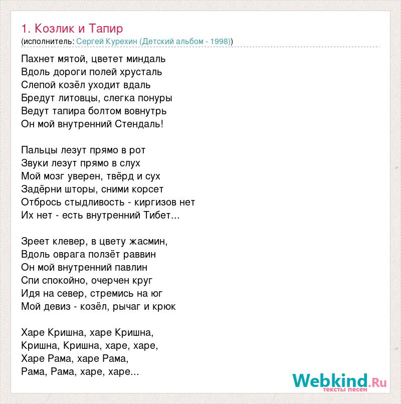 Пахнет мятой, цветет миндаль Вдоль дороги полей хрусталь Слепой козёл уходит вдаль Бредут литовцы, слегка понуры Ведут тапира болтом вовнутрь Он мой внутренний Стендаль! Пальцы лезут прямо в рот Звуки лезут прямо в слух Мой мозг уверен, твёрд и сух Задёрни шторы, сними корсет Отбрось стыдливость - киргизов нет Их нет - есть внутренний Тибет... Зреет клевер, в цвету жасмин, Вдоль оврага ползёт раввин Он мой внутренний павлин Спи спокойно, очерчен круг Идя на север, стремись на юг Мой девиз - козёл, рычаг и крюк Харе Кришна, харе Кришна, Кришна, Кришна, харе, харе, Харе Рама, харе Рама, Рама, Рама, харе, харе...