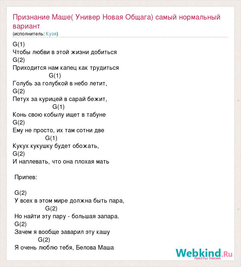 А как ты думаешь, о чем песня "Признание Маше( Универ Новая Общага) самый нормальный вариант" ?