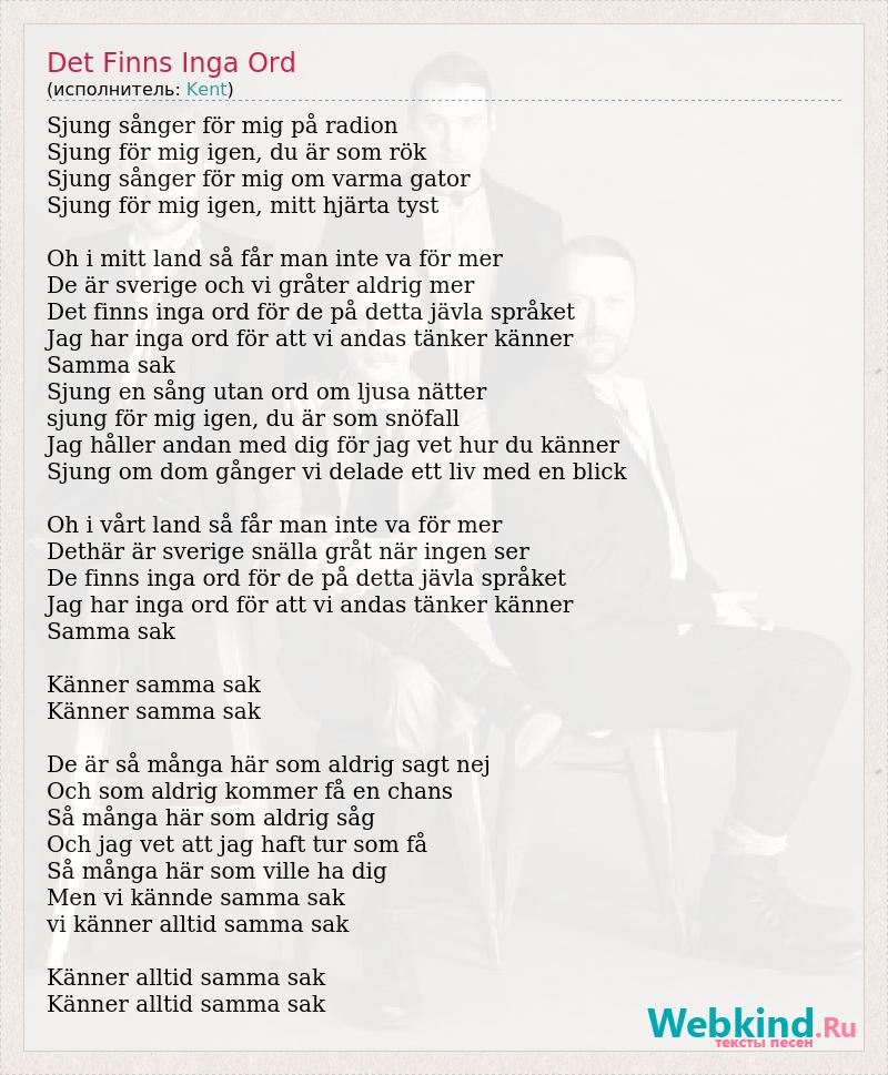 Sjung sånger för mig på radion Sjung för mig igen, du är som rök Sjung sånger för mig om varma gator Sjung för mig igen, mitt hjärta tyst Oh i mitt land så får man inte va för mer De är sverige och vi gråter aldrig mer Det finns inga ord för de på detta jävla språket Jag har inga ord för att vi andas tänker känner Samma sak Sjung en sång utan ord om ljusa nätter sjung för mig igen, du är som snöfall Jag håller andan med dig för jag vet hur du känner Sjung om dom gånger vi delade ett liv med en blick Oh i vårt land så får man inte va för mer Dethär är sverige snälla gråt när ingen ser De finns inga ord för de på detta jävla språket Jag har inga ord för att vi andas tänker känner Samma sak Känner samma sak Känner samma sak De är så många här som aldrig sagt nej Och som aldrig kommer få en chans Så många här som aldrig såg Och jag vet att jag haft tur som få Så många här som ville ha dig Men vi kännde samma sak vi känner alltid samma sak Känner alltid samma sak Känner alltid samma sak