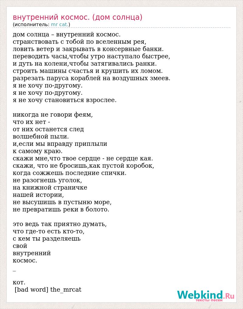 дом солнца – внутренний космос. странствовать с тобой по вселенным рея, ловить ветер и закрывать в консервные банки. переводить часы,чтобы утро наступало быстрее, и дуть на колени,чтобы затягивались ранки. строить машины счастья и крушить их ломом. разрезать паруса кораблей на воздушных змеев. я не хочу по-другому. я не хочу по-другому. я не хочу становиться взрослее. никогда не говори феям, что их нет - от них останется след волшебной пыли. и,если мы вправду приплыли к самому краю. скажи мне,что твое сердце - не сердце кая. скажи, что не бросишь,как пустой коробок, когда сожжешь последние спички. не разогнешь уголок, на книжной страничке нашей истории, не высушишь в пустыню море, не превратишь реки в болото. это ведь так приятно думать, что где-то есть кто-то, с кем ты разделяешь свой внутренний космос. _ кот. [bad word] the_mrcat