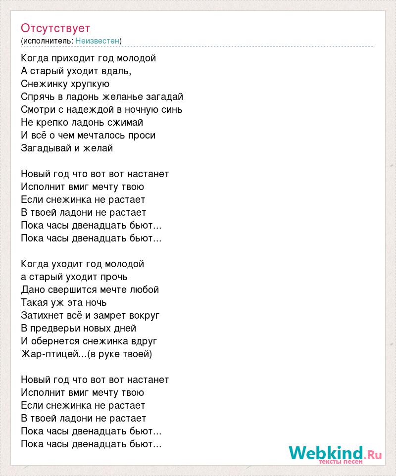 Когда приходит год молодой А старый уходит вдаль, Снежинку хрупкую Спрячь в ладонь желанье загадай Смотри с надеждой в ночную синь Не крепко ладонь сжимай И всё о чем мечталось проси Загадывай и желай Новый год что вот вот настанет Исполнит вмиг мечту твою Если снежинка не растает В твоей ладони не растает Пока часы двенадцать бьют... Пока часы двенадцать бьют... Когда уходит год молодой а старый уходит прочь Дано свершится мечте любой Такая уж эта ночь Затихнет всё и замрет вокруг В предверьи новых дней И обернется снежинка вдруг Жар-птицей...(в руке твоей) Новый год что вот вот настанет Исполнит вмиг мечту твою Если снежинка не растает В твоей ладони не растает Пока часы двенадцать бьют... Пока часы двенадцать бьют...