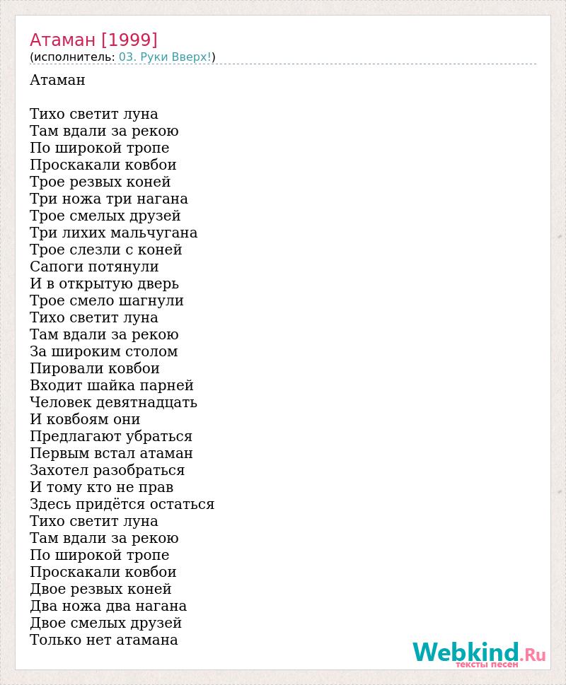 Атаман Тихо светит луна Там вдали за рекою По широкой тропе Проскакали ковбои Трое резвых коней Три ножа три нагана Трое смелых друзей Три лихих мальчугана Трое слезли с коней Сапоги потянули И в открытую дверь Трое смело шагнули Тихо светит луна Там вдали за рекою За широким столом Пировали ковбои Входит шайка парней Человек девятнадцать И ковбоям они Предлагают убраться Первым встал атаман Захотел разобраться И тому кто не прав Здесь придётся остаться Тихо светит луна Там вдали за рекою По широкой тропе Проскакали ковбои Двое резвых коней Два ножа два нагана Двое смелых друзей Только нет атамана