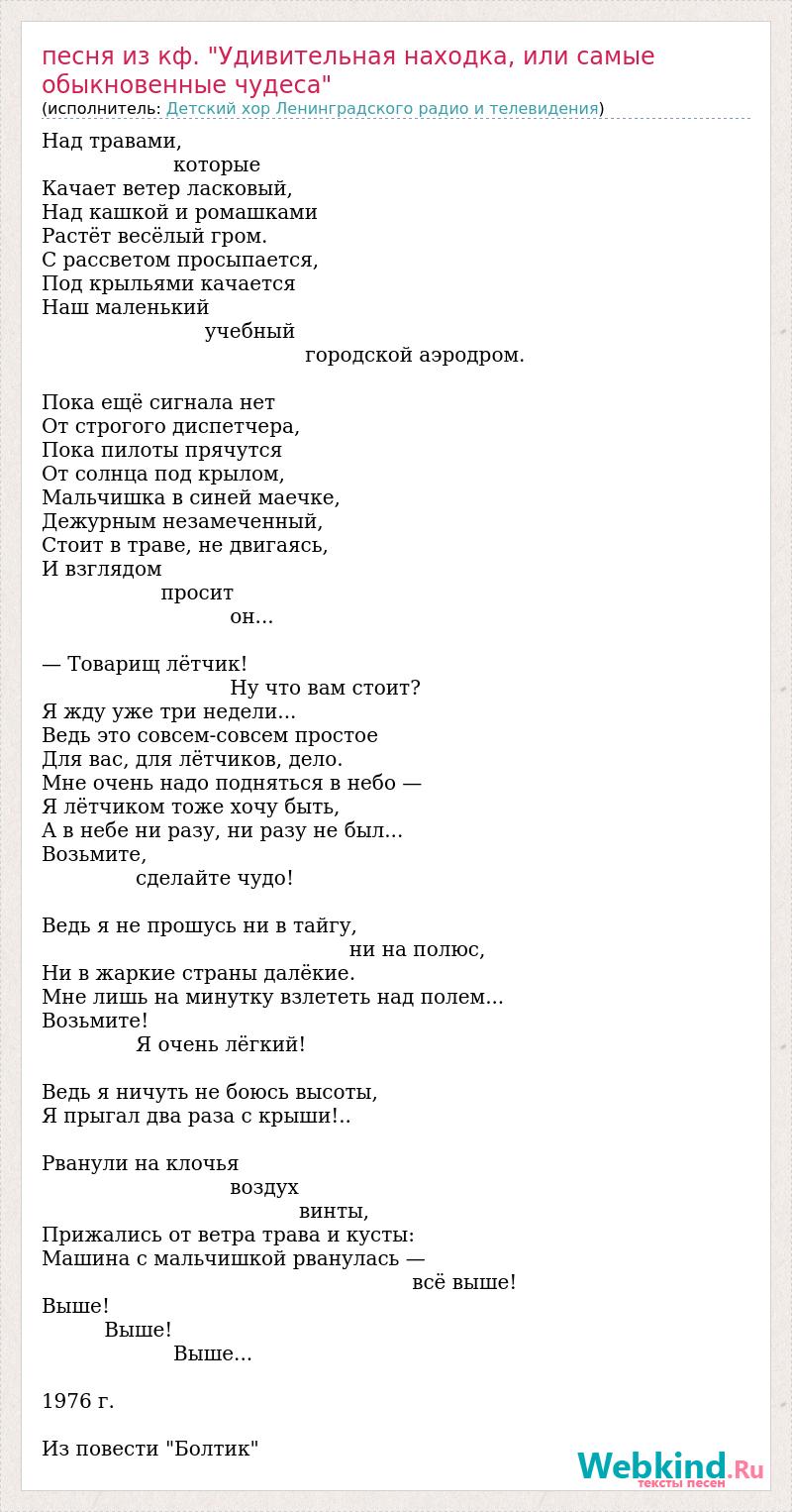 Главная→Исполнители→Детский хор Ленинградского радио и телевидения→Песня из кф. "Удивительная находка, или самые обыкновенные чудеса"