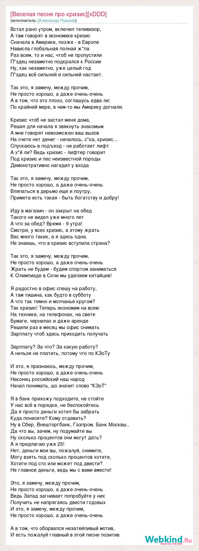 Встал рано утром, включил теливизор, А там говорят в экономике кризис Сначала в Америке, позже - в Европе Нависла глобальная полная ж*па Раз всем, то и нас, чтоб не пропустили П*здец незаметно подкрался к России Ну, как незаметно, уже целый год П*здец всё сильней и сильней настает. Так это, я замечу, между прочим, Не просто хорошо, а даже очень-очень А в том, что это плохо, соглашусь едва ли: По крайней мере, в чем-то мы Америку догнали. Кризис чтоб не застал меня дома, Решил для начала я звякнуть знакомым А мне говорят невозможен ваш вызов На счете нет денег - началось, с*ка, кризис... Спускаюсь в подъезд - не работает лифт А х*й ли? Ведь кризис - лифтер говорит Под кризис и пес неизвестной породы Демонстративно нагадил у входа Так это, я замечу, между прочим, Не просто хорошо, а даже очень-очень Вляпаться в дерьмо еще и поутру, Примета есть такая - быть богатству и добру! Иду в магазин - он закрыт на обед Такого не видел уже много лет А что за обед? Время - 9 утра! Смотри, у всех кризис, а этому жрать Вас много таких, а я здесь одна. Не знаешь, что в кризис вступила страна? Так это, я замечу, между прочим, Не просто хорошо, а даже очень-очень Жрать не будем - будем спортом заниматься К Олимпиаде в Сочи мы уделаем китайцев! Я радостно в офис спешу на работу, А там тишина, как будто в субботу А что так темно и молчанье кругом? Так кризис! Теперь экономим на всем: На технике, на телефонах, на свете Бумаге, чернилах и даже аренде Решили раз в месяц мы офис снимать Зарплату чтоб здесь приходить получать Зарплату? За что? За какую работу? А нельзя не платить, потому что по КЗоТу И это, я признаюсь, между прочим, Не просто хорошо, а даже очень-очень Наконец российский наш народ Начал понимать, шо значит слово "КЗоТ" Я в банк прихожу подходите, не стойте У нас всё в порядке, не беспокойтесь Да я просто деньги хотел бы забрать Куда понесете? Кому отдавать? Ну в Сбер, Внешторгбанк, Газпром, Банк Москвы.. Да что вы, зачем, ну подумайте вы Ну сколько процентов они могут дать? А я предлагаю уже 25! Нет, деньги мои вы, пожалуй, снимите, Могу взять под сколько процентов хотите, Хотите под сто или может под двести? Не главное деньги, ведь мы с вами вместе! Это, я замечу, между прочим, Не просто хорошо, а даже очень-очень Ведь Запад загнивает попробуйте у них Получить не напрягаясь двести годовых И это, я замечу, между прочим, Не просто хорошо, а даже очень-очень А в том, что оборвался незатейливый мотив, И есть пожалуй главный в этой песне позитив