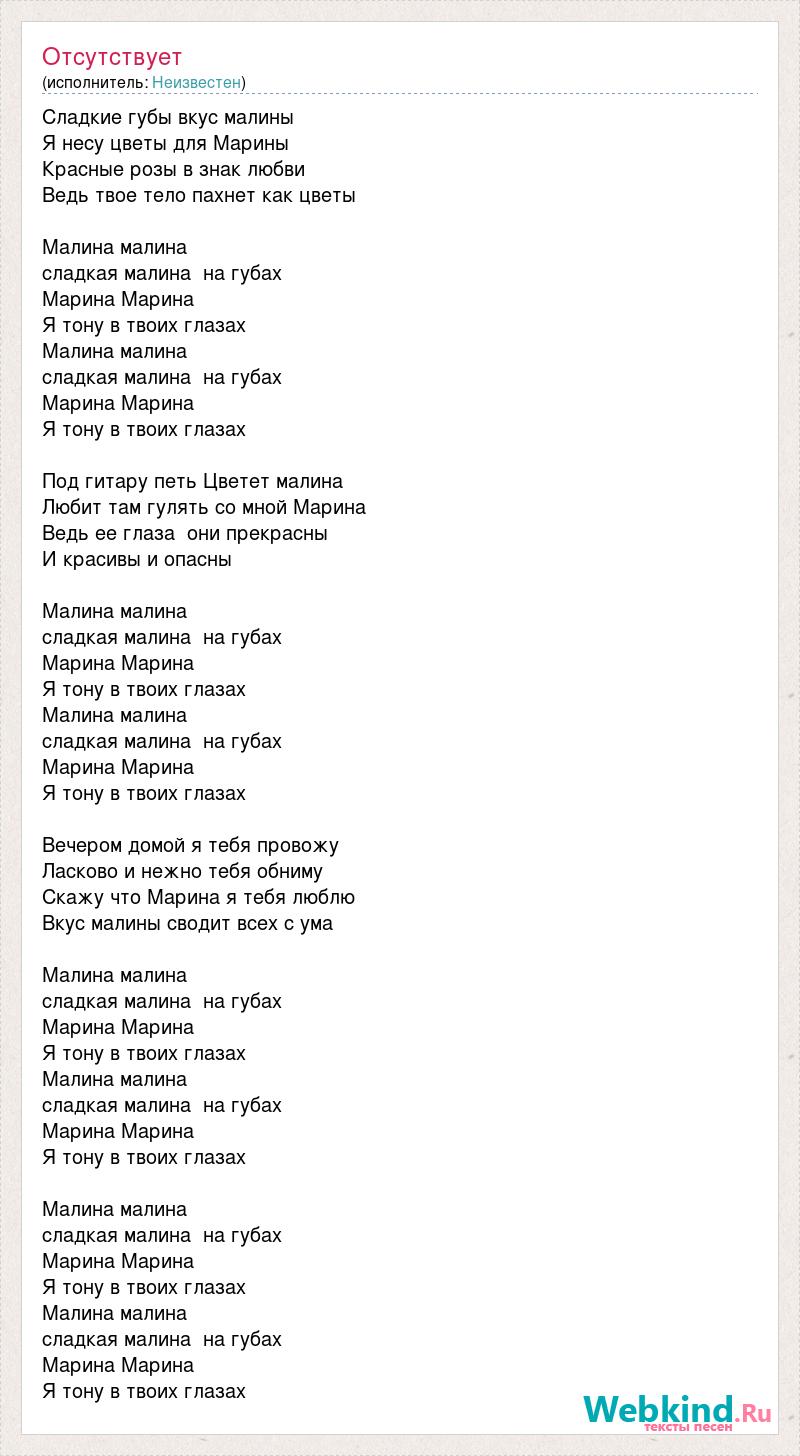 Сладкие губы вкус малины Я несу цветы для Марины Красные розы в знак любви Ведь твое тело пахнет как цветы Малина малина сладкая малина на губах Марина Марина Я тону в твоих глазах Малина малина сладкая малина на губах Марина Марина Я тону в твоих глазах Под гитару петь Цветет малина Любит там гулять со мной Марина Ведь ее глаза они прекрасны И красивы и опасны Малина малина сладкая малина на губах Марина Марина Я тону в твоих глазах Малина малина сладкая малина на губах Марина Марина Я тону в твоих глазах Вечером домой я тебя провожу Ласково и нежно тебя обниму Скажу что Марина я тебя люблю Вкус малины сводит всех с ума Малина малина сладкая малина на губах Марина Марина Я тону в твоих глазах Малина малина сладкая малина на губах Марина Марина Я тону в твоих глазах Малина малина сладкая малина на губах Марина Марина Я тону в твоих глазах Малина малина сладкая малина на губах Марина Марина Я тону в твоих глазах
