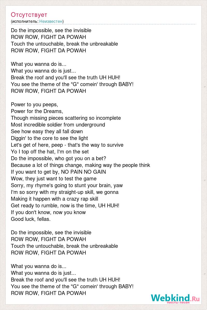 Do the impossible, see the invisible ROW ROW, FIGHT DA POWAH Touch the untouchable, break the unbreakable ROW ROW, FIGHT DA POWAH What you wanna do is... What you wanna do is just... Break the roof and you'll see the truth UH HUH! You see the theme of the "G" comein' through BABY! ROW ROW, FIGHT DA POWAH Power to you peeps, Power for the Dreams, Though missing pieces scattering so incomplete Most incredible soldier from underground See how easy they all fall down Diggin' to the core to see the light Let's get of here, peep - that's the way to survive Yo I top off the hat, I'm on the set Do the impossible, who got you on a bet? Because a lot of things change, making way the people think If you want to get by, NO PAIN NO GAIN Wow, they just want to test the game Sorry, my rhyme's going to stunt your brain, yaw I'm so sorry with my straight-up skill, we gonna Making it happen with a crazy rap skill Get ready to rumble, now is the time, UH HUH! If you don't know, now you know Good luck, fellas. Do the impossible, see the invisible ROW ROW, FIGHT DA POWAH Touch the untouchable, break the unbreakable ROW ROW, FIGHT DA POWAH What you wanna do is... What you wanna do is just... Break the roof and you'll see the truth UH HUH! You see the theme of the "G" comein' through BABY! ROW ROW, FIGHT DA POWAH