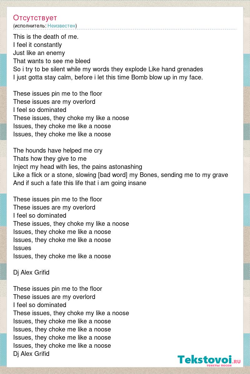 This is the death of me. I feel it constantly Just like an enemy That wants to see me bleed So i try to be silent while my words they explode Like hand grenades I just gotta stay calm, before i let this time Bomb blow up in my face. These issues pin me to the floor These issues are my overlord I feel so dominated These issues, they choke my like a noose Issues, they choke me like a noose Issues, they choke me like a noose The hounds have helped me cry Thats how they give to me Inject my head with lies, the pains astonashing Like a flick or a stone, slowing crushing my Bones, sending me to my grave And if such a fate this life that i am going insane These issues pin me to the floor These issues are my overlord I feel so dominated These issues, they choke my like a noose Issues, they choke me like a noose Issues, they choke me like a noose Issues Issues, they choke me like a noose Dj Alex Grifid These issues pin me to the floor These issues are my overlord I feel so dominated These issues, they choke my like a noose Issues, they choke me like a noose Issues, they choke me like a noose Issues, they choke me like a noose Issues, they choke me like a noose Dj Alex Grifid