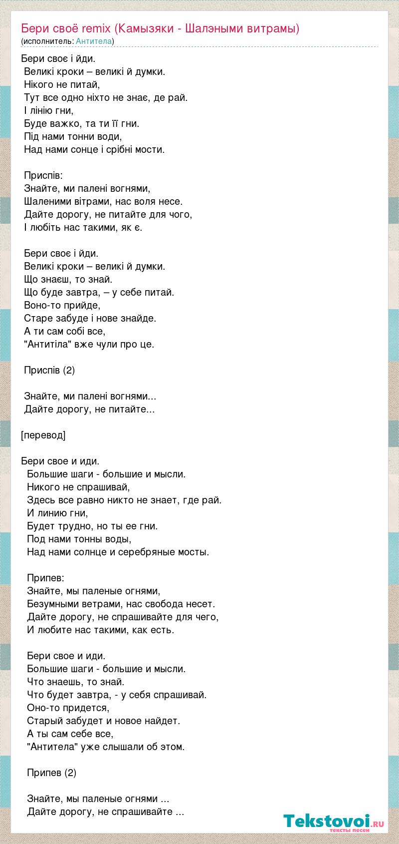 Бери своє і йди. Великі кроки – великі й думки. Нікого не питай, Тут все одно ніхто не знає, де рай. І лінію гни, Буде важко, та ти її гни. Під нами тонни води, Над нами сонце і срібні мости. Приспів: Знайте, ми палені вогнями, Шаленими вітрами, нас воля несе. Дайте дорогу, не питайте для чого, І любіть нас такими, як є. Бери своє і йди. Великі кроки – великі й думки. Що знаєш, то знай. Що буде завтра, – у себе питай. Воно-то прийде, Старе забуде і нове знайде. А ти сам собі все, "Антитіла" вже чули про це. Приспів (2) Знайте, ми палені вогнями... Дайте дорогу, не питайте... [перевод] Бери свое и иди. Большие шаги - большие и мысли. Никого не спрашивай, Здесь все равно никто не знает, где рай. И линию гни, Будет трудно, но ты ее гни. Под нами тонны воды, Над нами солнце и серебряные мосты. Припев: Знайте, мы паленые огнями, Безумными ветрами, нас свобода несет. Дайте дорогу, не спрашивайте для чего, И любите нас такими, как есть. Бери свое и иди. Большие шаги - большие и мысли. Что знаешь, то знай. Что будет завтра, - у себя спрашивай. Оно-то придется, Старый забудет и новое найдет. А ты сам себе все, "Антитела" уже слышали об этом. Припев (2) Знайте, мы паленые огнями ... Дайте дорогу, не спрашивайте ...
