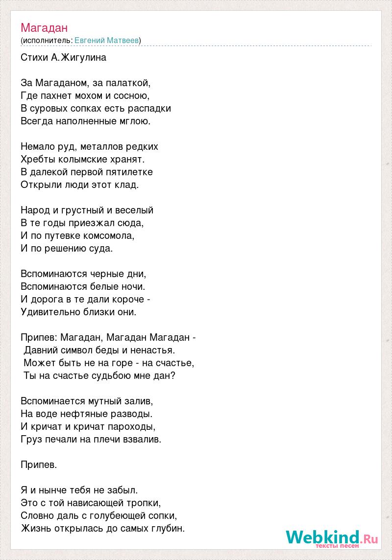 Стихи А.Жигулина За Магаданом, за палаткой, Где пахнет мохом и сосною, В суровых сопках есть распадки Всегда наполненные мглою. Немало руд, металлов редких Хребты колымские хранят. В далекой первой пятилетке Открыли люди этот клад. Народ и грустный и веселый В те годы приезжал сюда, И по путевке комсомола, И по решению суда. Вспоминаются черные дни, Вспоминаются белые ночи. И дорога в те дали короче - Удивительно близки они. Припев: Магадан, Магадан Магадан - Давний символ беды и ненастья. Может быть не на горе - на счастье, Ты на счастье судьбою мне дан? Вспоминается мутный залив, На воде нефтяные разводы. И кричат и кричат пароходы, Груз печали на плечи взвалив. Припев. Я и нынче тебя не забыл. Это с той нависающей тропки, Словно даль с голубеющей сопки, Жизнь открылась до самых глубин.