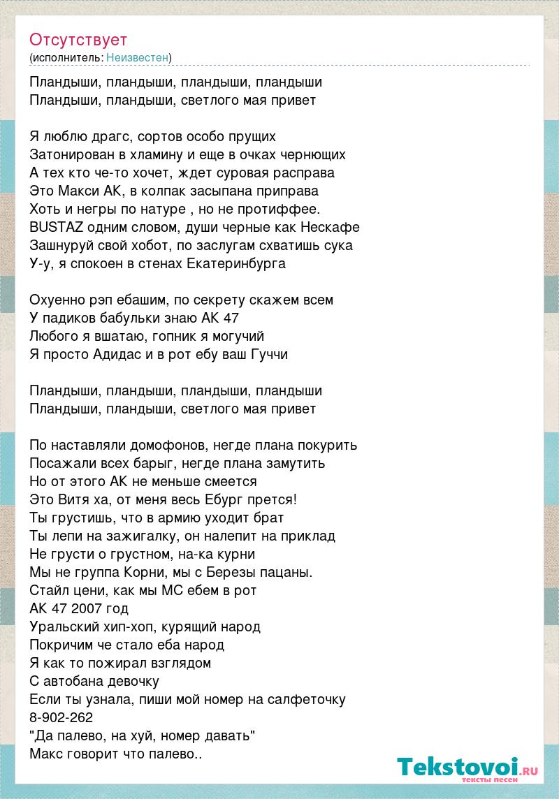 Пландыши, пландыши, пландыши, пландыши Пландыши, пландыши, светлого мая привет Я люблю драгс, сортов особо прущих Затонирован в хламину и еще в очках чернющих А тех кто че-то хочет, ждет суровая расправа Это Макси АК, в колпак засыпана приправа Хоть и негры по натуре , но не протиффее. BUSTAZ одним словом, души черные как Нескафе Зашнуруй свой хобот, по заслугам схватишь сука У-у, я спокоен в стенах Екатеринбурга Охуенно рэп ебашим, по секрету скажем всем У падиков бабульки знаю АК 47 Любого я вшатаю, гопник я могучий Я просто Адидас и в рот ебу ваш Гуччи Пландыши, пландыши, пландыши, пландыши Пландыши, пландыши, светлого мая привет По наставляли домофонов, негде плана покурить Посажали всех барыг, негде плана замутить Но от этого АК не меньше смеется Это Витя ха, от меня весь Ебург прется! Ты грустишь, что в армию уходит брат Ты лепи на зажигалку, он налепит на приклад Не грусти о грустном, на-ка курни Мы не группа Корни, мы с Березы пацаны. Стайл цени, как мы МС ебем в рот АК 47 2007 год Уральский хип-хоп, курящий народ Покричим че стало еба народ Я как то пожирал взглядом С автобана девочку Если ты узнала, пиши мой номер на салфеточку 8-902-262 "Да палево, на хуй, номер давать" Макс говорит что палево..