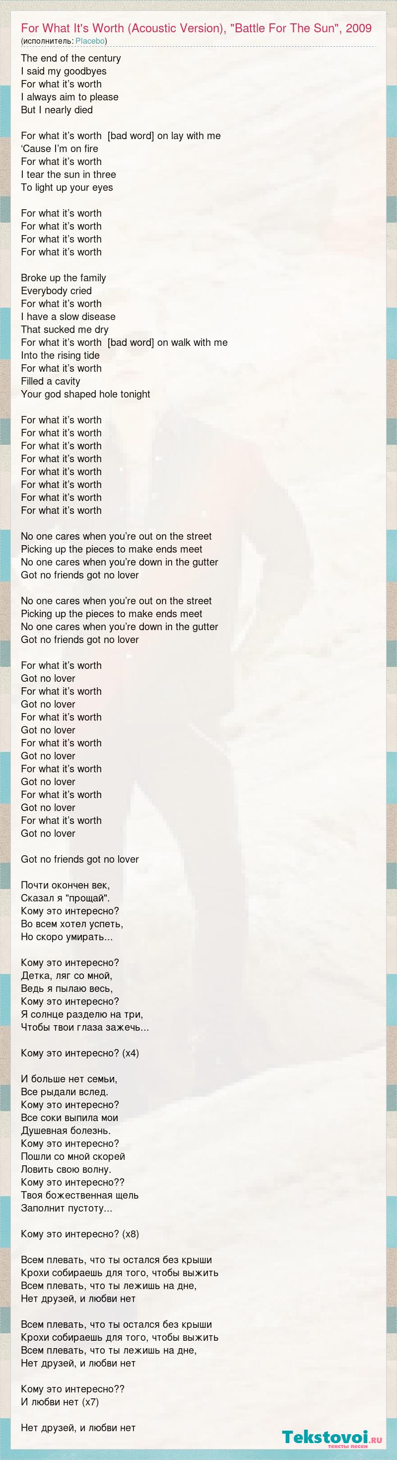 The end of the century I said my goodbyes For what it’s worth I always aim to please But I nearly died For what it’s worth [bad word] on lay with me ‘Cause I’m on fire For what it’s worth I tear the sun in three To light up your eyes For what it’s worth For what it’s worth For what it’s worth For what it’s worth Broke up the family Everybody cried For what it’s worth I have a slow disease That sucked me dry For what it’s worth [bad word] on walk with me Into the rising tide For what it’s worth Filled a cavity Your god shaped hole tonight For what it’s worth For what it’s worth For what it’s worth For what it’s worth For what it’s worth For what it’s worth For what it’s worth For what it’s worth No one cares when you’re out on the street Picking up the pieces to make ends meet No one cares when you’re down in the gutter Got no friends got no lover No one cares when you’re out on the street Picking up the pieces to make ends meet No one cares when you’re down in the gutter Got no friends got no lover For what it’s worth Got no lover For what it’s worth Got no lover For what it’s worth Got no lover For what it’s worth Got no lover For what it’s worth Got no lover For what it’s worth Got no lover For what it’s worth Got no lover Got no friends got no lover Почти окончен век, Сказал я "прощай". Кому это интересно? Во всем хотел успеть, Но скоро умирать... Кому это интересно? Детка, ляг со мной, Ведь я пылаю весь, Кому это интересно? Я солнце разделю на три, Чтобы твои глаза зажечь... Кому это интересно? (х4) И больше нет семьи, Все рыдали вслед. Кому это интересно? Все соки выпила мои Душевная болезнь. Кому это интересно? Пошли со мной скорей Ловить свою волну. Кому это интересно?? Твоя божественная щель Заполнит пустоту... Кому это интересно? (х8) Всем плевать, что ты остался без крыши Крохи собираешь для того, чтобы выжить Всем плевать, что ты лежишь на дне, Нет друзей, и любви нет Всем плевать, что ты остался без крыши Крохи собираешь для того, чтобы выжить Всем плевать, что ты лежишь на дне, Нет друзей, и любви нет Кому это интересно?? И любви нет (х7) Нет друзей, и любви нет