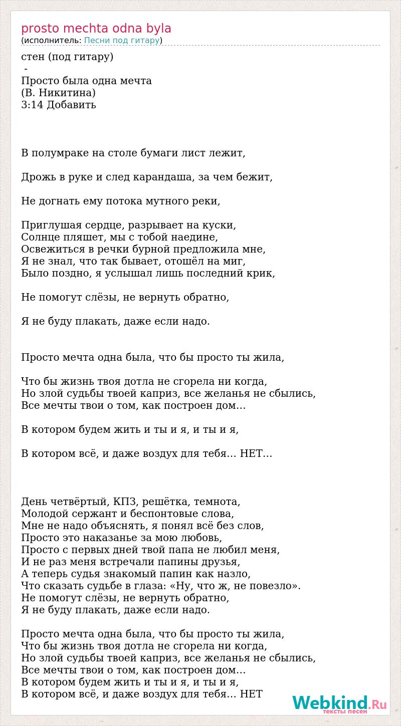 стен (под гитару) - Просто была одна мечта (В. Никитина) 3:14 Добавить В полумраке на столе бумаги лист лежит, Дрожь в руке и след карандаша, за чем бежит, Не догнать ему потока мутного реки, Приглушая сердце, разрывает на куски, Солнце пляшет, мы с тобой наедине, Освежиться в речки бурной предложила мне, Я не знал, что так бывает, отошёл на миг, Было поздно, я услышал лишь последний крик, Не помогут слёзы, не вернуть обратно, Я не буду плакать, даже если надо. Просто мечта одна была, что бы просто ты жила, Что бы жизнь твоя дотла не сгорела ни когда, Но злой судьбы твоей каприз, все желанья не сбылись, Все мечты твои о том, как построен дом… В котором будем жить и ты и я, и ты и я, В котором всё, и даже воздух для тебя… НЕТ… День четвёртый, КПЗ, решётка, темнота, Молодой сержант и беспонтовые слова, Мне не надо объяснять, я понял всё без слов, Просто это наказанье за мою любовь, Просто с первых дней твой папа не любил меня, И не раз меня встречали папины друзья, А теперь судья знакомый папин как назло, Что сказать судьбе в глаза: «Ну, что ж, не повезло». Не помогут слёзы, не вернуть обратно, Я не буду плакать, даже если надо. Просто мечта одна была, что бы просто ты жила, Что бы жизнь твоя дотла не сгорела ни когда, Но злой судьбы твоей каприз, все желанья не сбылись, Все мечты твои о том, как построен дом… В котором будем жить и ты и я, и ты и я, В котором всё, и даже воздух для тебя… НЕТ