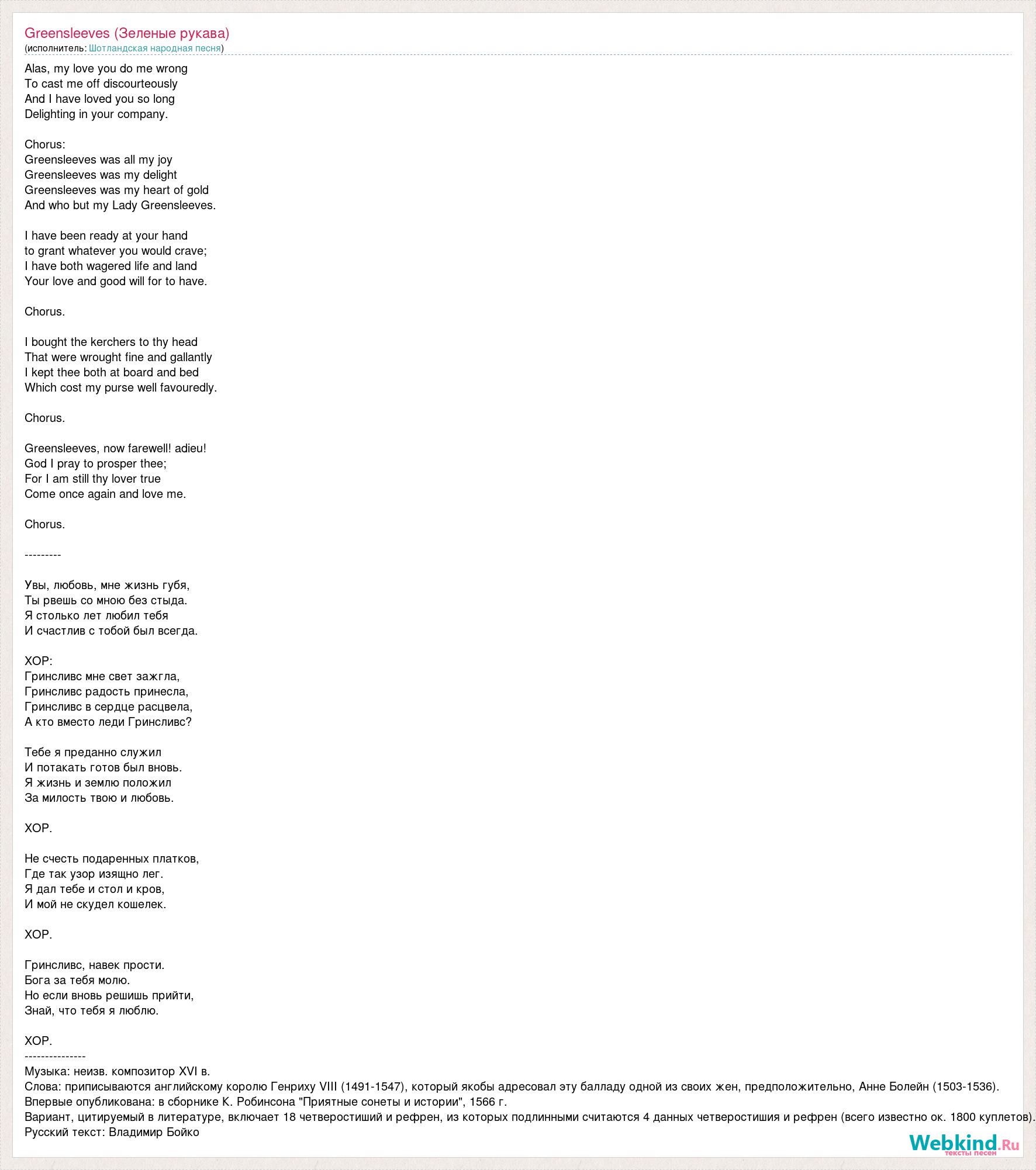 Alas, my love you do me wrong To cast me off discourteously And I have loved you so long Delighting in your company. Chorus: Greensleeves was all my joy Greensleeves was my delight Greensleeves was my heart of gold And who but my Lady Greensleeves. I have been ready at your hand to grant whatever you would crave; I have both wagered life and land Your love and good will for to have. Chorus. I bought the kerchers to thy head That were wrought fine and gallantly I kept thee both at board and bed Which cost my purse well favouredly. Chorus. Greensleeves, now farewell! adieu! God I pray to prosper thee; For I am still thy lover true Come once again and love me. Chorus. --------- Увы, любовь, мне жизнь губя, Ты рвешь со мною без стыда. Я столько лет любил тебя И счастлив с тобой был всегда. ХОР: Гринсливс мне свет зажгла, Гринсливс радость принесла, Гринсливс в сердце расцвела, А кто вместо леди Гринсливс? Тебе я преданно служил И потакать готов был вновь. Я жизнь и землю положил За милость твою и любовь. ХОР. Не счесть подаренных платков, Где так узор изящно лег. Я дал тебе и стол и кров, И мой не скудел кошелек. ХОР. Гринсливс, навек прости. Бога за тебя молю. Но если вновь решишь прийти, Знай, что тебя я люблю. ХОР. --------------- Музыка: неизв. композитор XVI в. Слова: приписываются английскому королю Генриху VIII (1491-1547), который якобы адресовал эту балладу одной из своих жен, предположительно, Анне Болейн (1503-1536). Впервые опубликована: в сборнике К. Робинсона "Приятные сонеты и истории", 1566 г. Вариант, цитируемый в литературе, включает 18 четверостиший и рефрен, из которых подлинными считаются 4 данных четверостишия и рефрен (всего известно ок. 1800 куплетов). Русский текст: Владимир Бойко