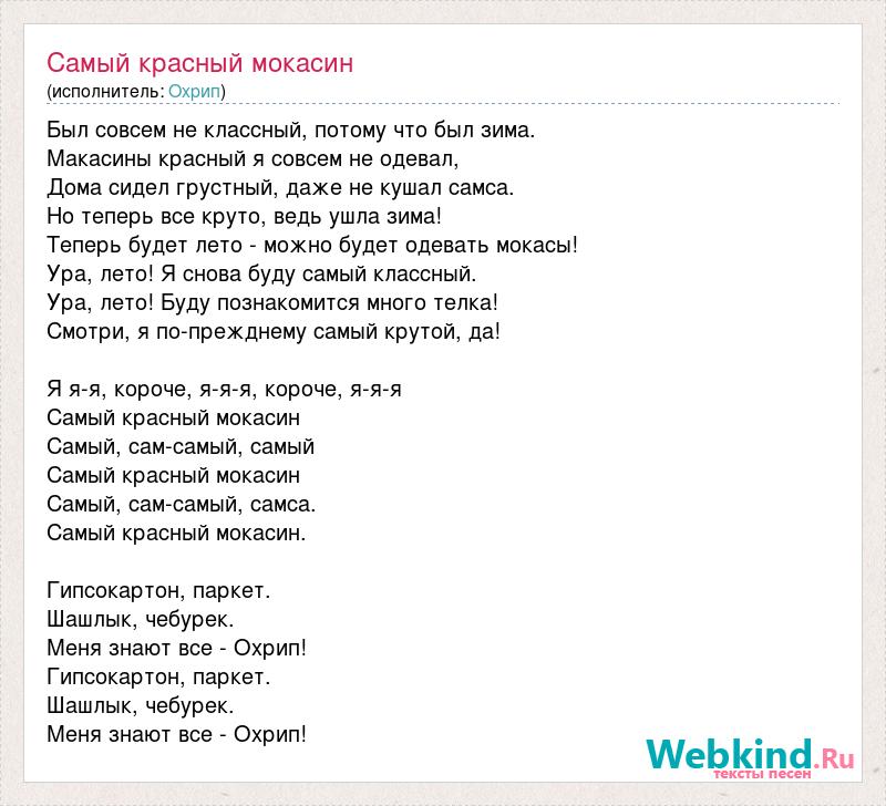 Был совсем не классный, потому что был зима. Макасины красный я совсем не одевал, Дома сидел грустный, даже не кушал самса. Но теперь все круто, ведь ушла зима! Теперь будет лето - можно будет одевать мокасы! Ура, лето! Я снова буду самый классный. Ура, лето! Буду познакомится много телка! Смотри, я по-прежднему самый крутой, да! Я я-я, короче, я-я-я, короче, я-я-я Самый красный мокасин Самый, сам-самый, самый Самый красный мокасин Самый, сам-самый, самса. Самый красный мокасин. Гипсокартон, паркет. Шашлык, чебурек. Меня знают все - Охрип! Гипсокартон, паркет. Шашлык, чебурек. Меня знают все - Охрип!