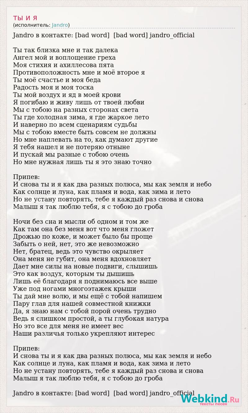 Jandro в контакте: [bad word] [bad word] jandro_official Ты так близка мне и так далека Ангел мой и воплощение греха Моя стихия и ахиллесова пята Противоположность мне и моё второе я Ты моё счастье и моя беда Радость моя и моя тоска Ты мой воздух и яд в моей крови Я погибаю и живу лишь от твоей любви Мы с тобою на разных сторонах света Ты где холодная зима, я где жаркое лето И наверно по всем сценариям судьбы Мы с тобою вместе быть совсем не должны Но мне наплевать на то, как думают другие Я тебя нашел и не потеряю отныне И пускай мы разные с тобою очень Но мне нужная лишь ты я это знаю точно Припев: И снова ты и я как два разных полюса, мы как земля и небо Как солнце и луна, как пламя и вода, как зима и лето Но не устану повторять, тебе я каждый раз снова и снова Малыш я так люблю тебя, я с тобою до гроба Ночи без сна и мысли об одном и том же Как там она без меня вот что меня гложет Дрожью по коже, и может было бы проще Забыть о ней, нет, это же невозможно Нет, братец, ведь это чувство окрыляет Она меня не губит, она меня вдохновляет Дает мне силы на новые подвиги, слышишь Это как воздух, которым ты дышишь Лишь её благодаря я поднимаюсь все выше Уже под ногами многоэтажек крыши Ты дай мне волю, и мы ещё с тобой напишем Пару глав для нашей совместной книжки Да, я знаю нам с тобой порой очень трудно Ведь я слишком простой, а ты глубокая натура Но это все для меня не имеет вес Наши различья только укрепляют интерес Припев: И снова ты и я как два разных полюса, мы как земля и небо Как солнце и луна, как пламя и вода, как зима и лето Но не устану повторять, тебе я каждый раз снова и снова Малыш я так люблю тебя, я с тобою до гроба Jandro в контакте: [bad word] [bad word] jandro_official