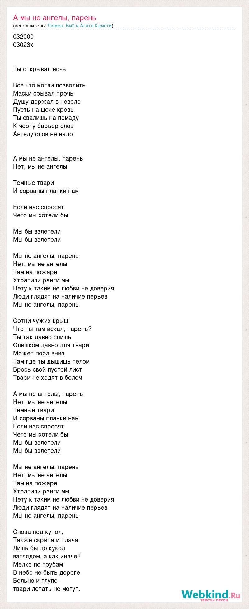 032000 03023x Ты открывал ночь Всё что могли позволить Маски срывал прочь Душу держал в неволе Пусть на щеке кровь Ты свалишь на помаду К черту барьер слов Ангелу слов не надо А мы не ангелы, парень Нет, мы не ангелы Темные твари И сорваны планки нам Если нас спросят Чего мы хотели бы Мы бы взлетели Мы бы взлетели Мы не ангелы, парень Нет, мы не ангелы Там на пожаре Утратили ранги мы Нету к таким не любви не доверия Люди глядят на наличие перьев Мы не ангелы, парень Сотни чужих крыш Что ты там искал, парень? Ты так давно спишь Слишком давно для твари Может пора вниз Там где ты дышишь телом Брось свой пустой лист Твари не ходят в белом А мы не ангелы, парень Нет, мы не ангелы Темные твари И сорваны планки нам Если нас спросят Чего мы хотели бы Мы бы взлетели Мы бы взлетели Мы не ангелы, парень Нет, мы не ангелы Там на пожаре Утратили ранги мы Нету к таким не любви не доверия Люди глядят на наличие перьев Мы не ангелы, парень Снова под купол, Также скрипя и плача. Лишь бы до кукол взглядом, а как иначе? Мелко по трубам В небо не быть дороге Больно и глупо - твари летать не могут.