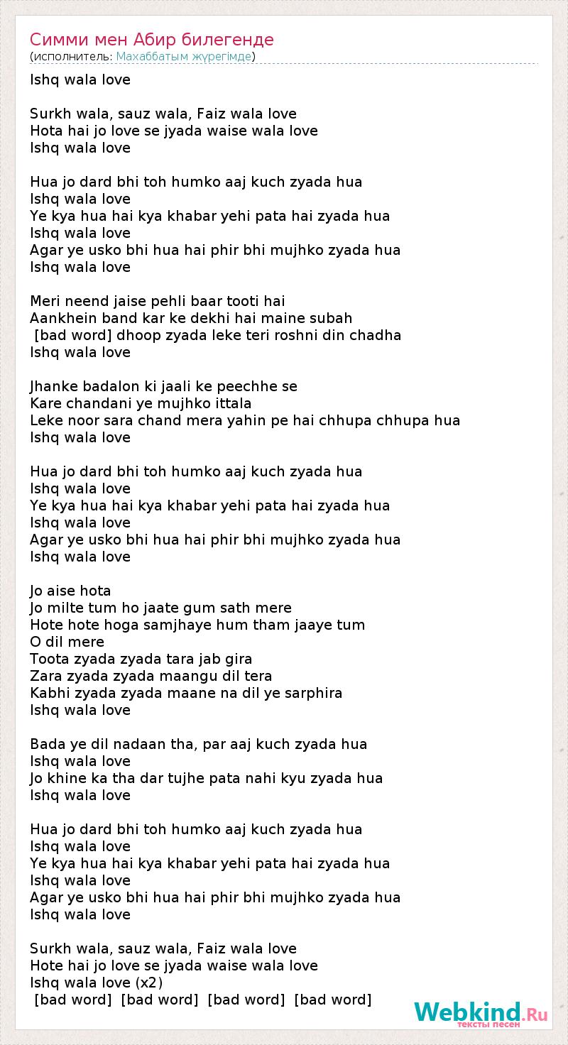 Ishq wala love Surkh wala, sauz wala, Faiz wala love Hota hai jo love se jyada waise wala love Ishq wala love Hua jo dard bhi toh humko aaj kuch zyada hua Ishq wala love Ye kya hua hai kya khabar yehi pata hai zyada hua Ishq wala love Agar ye usko bhi hua hai phir bhi mujhko zyada hua Ishq wala love Meri neend jaise pehli baar tooti hai Aankhein band kar ke dekhi hai maine subah [bad word] dhoop zyada leke teri roshni din chadha Ishq wala love Jhanke badalon ki jaali ke peechhe se Kare chandani ye mujhko ittala Leke noor sara chand mera yahin pe hai chhupa chhupa hua Ishq wala love Hua jo dard bhi toh humko aaj kuch zyada hua Ishq wala love Ye kya hua hai kya khabar yehi pata hai zyada hua Ishq wala love Agar ye usko bhi hua hai phir bhi mujhko zyada hua Ishq wala love Jo aise hota Jo milte tum ho jaate gum sath mere Hote hote hoga samjhaye hum tham jaaye tum O dil mere Toota zyada zyada tara jab gira Zara zyada zyada maangu dil tera Kabhi zyada zyada maane na dil ye sarphira Ishq wala love Bada ye dil nadaan tha, par aaj kuch zyada hua Ishq wala love Jo khine ka tha dar tujhe pata nahi kyu zyada hua Ishq wala love Hua jo dard bhi toh humko aaj kuch zyada hua Ishq wala love Ye kya hua hai kya khabar yehi pata hai zyada hua Ishq wala love Agar ye usko bhi hua hai phir bhi mujhko zyada hua Ishq wala love Surkh wala, sauz wala, Faiz wala love Hote hai jo love se jyada waise wala love Ishq wala love (x2) [bad word] [bad word] [bad word] [bad word]