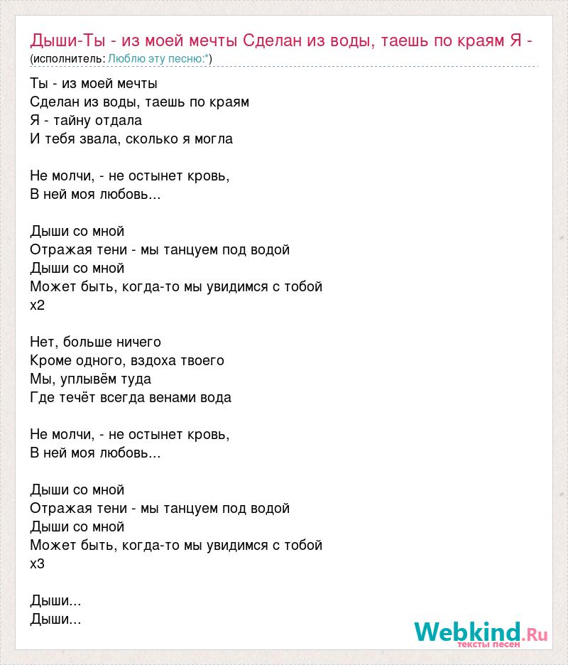 Ты - из моей мечты Сделан из воды, таешь по краям Я - тайну отдала И тебя звала, сколько я могла Не молчи, - не остынет кровь, В ней моя любовь... Дыши со мной Отражая тени - мы танцуем под водой Дыши со мной Может быть, когда-то мы увидимся с тобой x2 Нет, больше ничего Кроме одного, вздоха твоего Мы, уплывём туда Где течёт всегда венами вода Не молчи, - не остынет кровь, В ней моя любовь... Дыши со мной Отражая тени - мы танцуем под водой Дыши со мной Может быть, когда-то мы увидимся с тобой x3 Дыши... Дыши...
