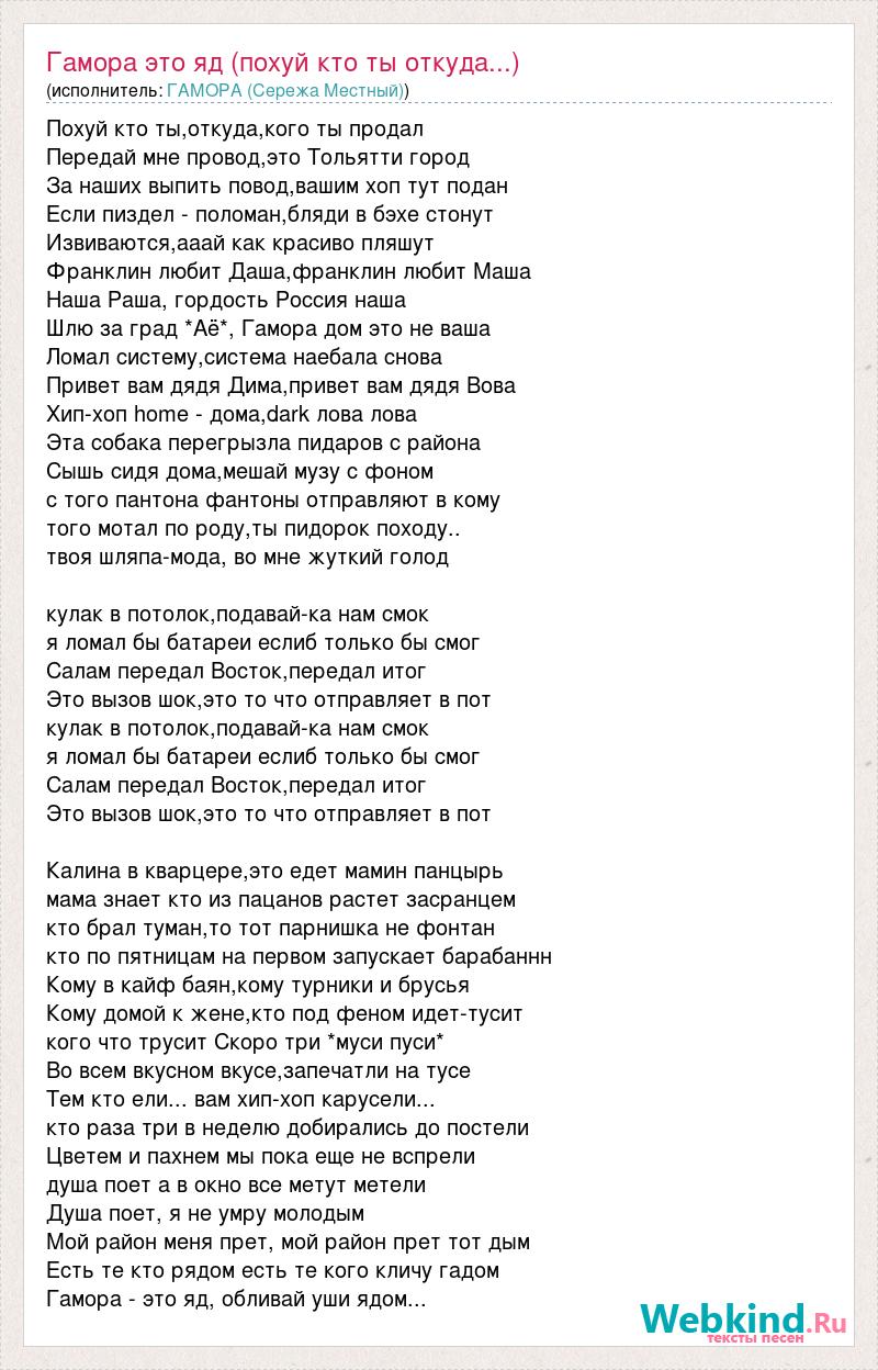 Похуй кто ты,откуда,кого ты продал Передай мне провод,это Тольятти город За наших выпить повод,вашим хоп тут подан Если пиздел - поломан,бляди в бэхе стонут Извиваются,ааай как красиво пляшут Франклин любит Даша,франклин любит Маша Наша Раша, гордость Россия наша Шлю за град *Аё*, Гамора дом это не ваша Ломал систему,система наебала снова Привет вам дядя Дима,привет вам дядя Вова Хип-хоп homе - дома,dark лова лова Эта собака перегрызла пидаров с района Сышь сидя дома,мешай музу с фоном с того пантона фантоны отправляют в кому того мотал по роду,ты пидорок походу.. твоя шляпа-мода, во мне жуткий голод кулак в потолок,подавай-ка нам смок я ломал бы батареи еслиб только бы смог Салам передал Восток,передал итог Это вызов шок,это то что отправляет в пот кулак в потолок,подавай-ка нам смок я ломал бы батареи еслиб только бы смог Салам передал Восток,передал итог Это вызов шок,это то что отправляет в пот Калина в кварцере,это едет мамин панцырь мама знает кто из пацанов растет засранцем кто брал туман,то тот парнишка не фонтан кто по пятницам на первом запускает барабаннн Кому в кайф баян,кому турники и брусья Кому домой к жене,кто под феном идет-тусит кого что трусит Скоро три *муси пуси* Во всем вкусном вкусе,запечатли на тусе Тем кто ели... вам хип-хоп карусели... кто раза три в неделю добирались до постели Цветем и пахнем мы пока еще не вспрели душа поет а в окно все метут метели Душа поет, я не умру молодым Мой район меня прет, мой район прет тот дым Есть те кто рядом есть те кого кличу гадом Гамора - это яд, обливай уши ядом...