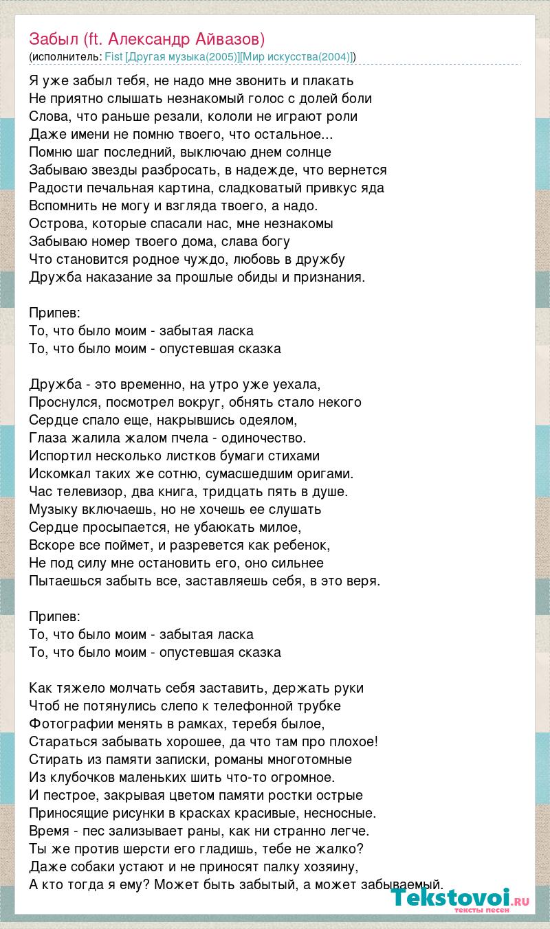 Я уже забыл тебя, не надо мне звонить и плакать Не приятно слышать незнакомый голос с долей боли Слова, что раньше резали, кололи не играют роли Даже имени не помню твоего, что остальное... Помню шаг последний, выключаю днем солнце Забываю звезды разбросать, в надежде, что вернется Радости печальная картина, сладковатый привкус яда Вспомнить не могу и взгляда твоего, а надо. Острова, которые спасали нас, мне незнакомы Забываю номер твоего дома, слава богу Что становится родное чуждо, любовь в дружбу Дружба наказание за прошлые обиды и признания. Припев: То, что было моим - забытая ласка То, что было моим - опустевшая сказка Дружба - это временно, на утро уже уехала, Проснулся, посмотрел вокруг, обнять стало некого Сердце спало еще, накрывшись одеялом, Глаза жалила жалом пчела - одиночество. Испортил несколько листков бумаги стихами Искомкал таких же сотню, сумасшедшим оригами. Час телевизор, два книга, тридцать пять в душе. Музыку включаешь, но не хочешь ее слушать Сердце просыпается, не убаюкать милое, Вскоре все поймет, и разревется как ребенок, Не под силу мне остановить его, оно сильнее Пытаешься забыть все, заставляешь себя, в это веря. Припев: То, что было моим - забытая ласка То, что было моим - опустевшая сказка Как тяжело молчать себя заставить, держать руки Чтоб не потянулись слепо к телефонной трубке Фотографии менять в рамках, теребя былое, Стараться забывать хорошее, да что там про плохое! Стирать из памяти записки, романы многотомные Из клубочков маленьких шить что-то огромное. И пестрое, закрывая цветом памяти ростки острые Приносящие рисунки в красках красивые, несносные. Время - пес зализывает раны, как ни странно легче. Ты же против шерсти его гладишь, тебе не жалко? Даже собаки устают и не приносят палку хозяину, А кто тогда я ему? Может быть забытый, а может забываемый.