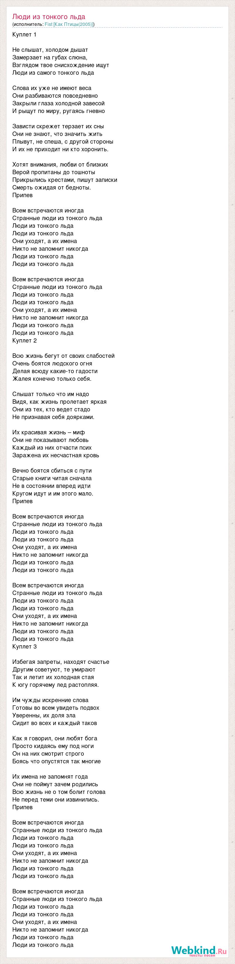 Куплет 1 Не слышат, холодом дышат Замерзает на губах слюна, Взглядом твое снисхождение ищут Люди из самого тонкого льда Слова их уже не имеют веса Они разбиваются повседневно Закрыли глаза холодной завесой И рыщут по миру, ругаясь гневно Зависти скрежет терзает их сны Они не знают, что значить жить Плывут, не спеша, с другой стороны И их не приходит ни кто хоронить. Хотят внимания, любви от близких Верой пропитаны до тошноты Прикрылись крестами, пишут записки Смерть ожидая от бедноты. Припев Всем встречаются иногда Странные люди из тонкого льда Люди из тонкого льда Люди из тонкого льда Они уходят, а их имена Никто не запомнит никогда Люди из тонкого льда Люди из тонкого льда Всем встречаются иногда Странные люди из тонкого льда Люди из тонкого льда Люди из тонкого льда Они уходят, а их имена Никто не запомнит никогда Люди из тонкого льда Люди из тонкого льда Куплет 2 Всю жизнь бегут от своих слабостей Очень боятся людского огня Делая всюду какие-то гадости Жалея конечно только себя. Слышат только что им надо Видя, как жизнь пролетает яркая Они из тех, кто ведет стадо Не признавая себя доярками. Их красивая жизнь – миф Они не показывают любовь Каждый из них отчасти псих Заражена их несчастная кровь Вечно боятся сбиться с пути Старые книги читая сначала Не в состоянии вперед идти Кругом идут и им этого мало. Припев Всем встречаются иногда Странные люди из тонкого льда Люди из тонкого льда Люди из тонкого льда Они уходят, а их имена Никто не запомнит никогда Люди из тонкого льда Люди из тонкого льда Всем встречаются иногда Странные люди из тонкого льда Люди из тонкого льда Люди из тонкого льда Они уходят, а их имена Никто не запомнит никогда Люди из тонкого льда Люди из тонкого льда Куплет 3 Избегая запреты, находят счастье Другим советуют, те умирают Так и летит их холодная стая К югу горячему лед растопляя. Им чужды искренние слова Готовы во всем увидеть подвох Уверенны, их доля зла Сидит во всех и каждый таков Как я говорил, они любят бога Просто кидаясь ему под ноги Он на них смотрит строго Боясь что опустятся так многие Их имена не запомнят года Они не поймут зачем родились Всю жизнь не о том болит голова Не перед теми они извинились. Припев Всем встречаются иногда Странные люди из тонкого льда Люди из тонкого льда Люди из тонкого льда Они уходят, а их имена Никто не запомнит никогда Люди из тонкого льда Люди из тонкого льда Всем встречаются иногда Странные люди из тонкого льда Люди из тонкого льда Люди из тонкого льда Они уходят, а их имена Никто не запомнит никогда Люди из тонкого льда Люди из тонкого льда