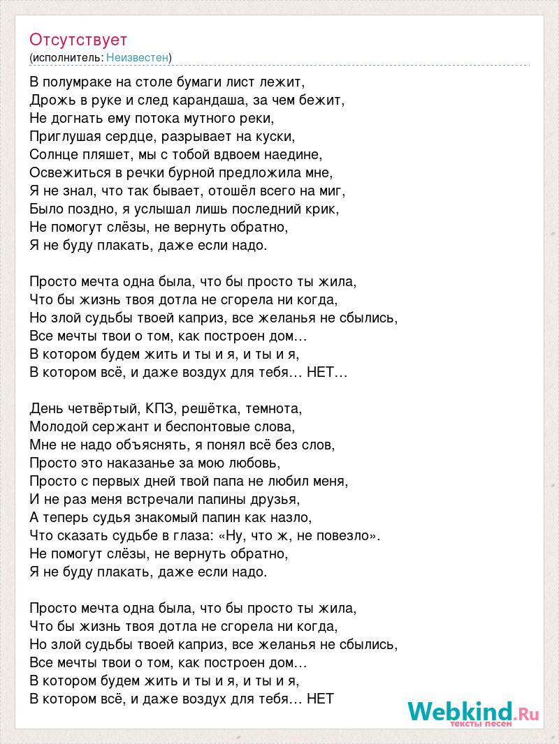В полумраке на столе бумаги лист лежит, Дрожь в руке и след карандаша, за чем бежит, Не догнать ему потока мутного реки, Приглушая сердце, разрывает на куски, Солнце пляшет, мы с тобой вдвоем наедине, Освежиться в речки бурной предложила мне, Я не знал, что так бывает, отошёл всего на миг, Было поздно, я услышал лишь последний крик, Не помогут слёзы, не вернуть обратно, Я не буду плакать, даже если надо. Просто мечта одна была, что бы просто ты жила, Что бы жизнь твоя дотла не сгорела ни когда, Но злой судьбы твоей каприз, все желанья не сбылись, Все мечты твои о том, как построен дом… В котором будем жить и ты и я, и ты и я, В котором всё, и даже воздух для тебя… НЕТ… День четвёртый, КПЗ, решётка, темнота, Молодой сержант и беспонтовые слова, Мне не надо объяснять, я понял всё без слов, Просто это наказанье за мою любовь, Просто с первых дней твой папа не любил меня, И не раз меня встречали папины друзья, А теперь судья знакомый папин как назло, Что сказать судьбе в глаза: «Ну, что ж, не повезло». Не помогут слёзы, не вернуть обратно, Я не буду плакать, даже если надо. Просто мечта одна была, что бы просто ты жила, Что бы жизнь твоя дотла не сгорела ни когда, Но злой судьбы твоей каприз, все желанья не сбылись, Все мечты твои о том, как построен дом… В котором будем жить и ты и я, и ты и я, В котором всё, и даже воздух для тебя… НЕТ
