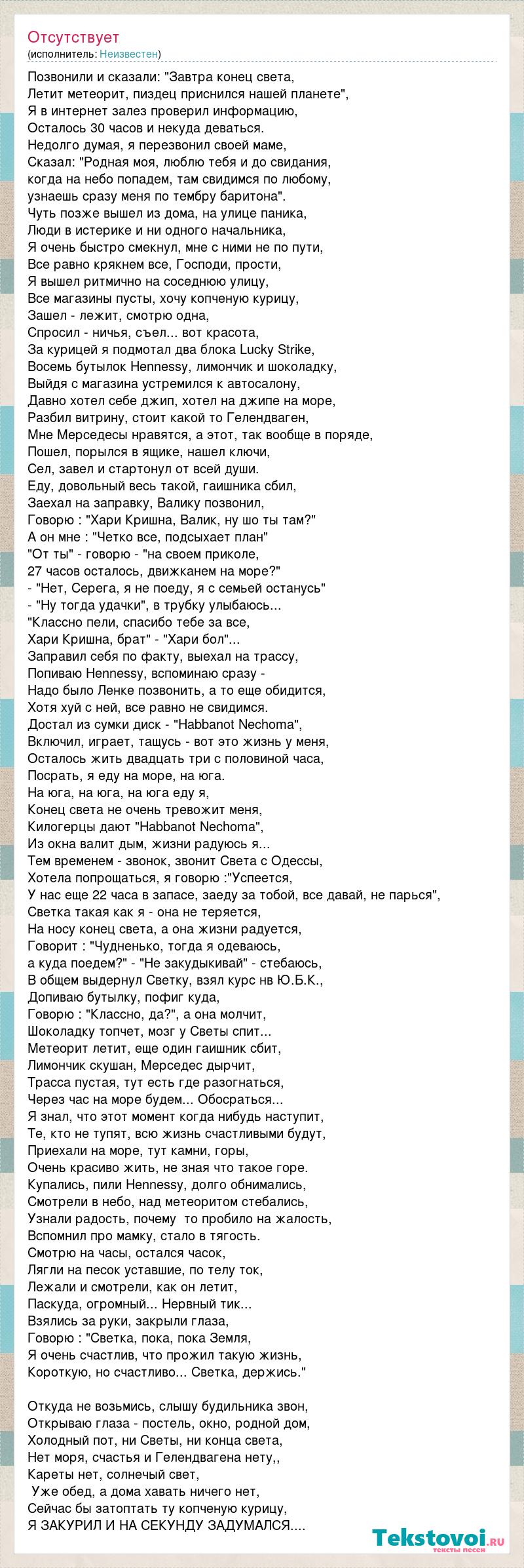 Позвонили и сказали: "Завтра конец света, Летит метеорит, пиздец приснился нашей планете", Я в интернет залез проверил информацию, Осталось 30 часов и некуда деваться. Недолго думая, я перезвонил своей маме, Сказал: "Родная моя, люблю тебя и до свидания, когда на небо попадем, там свидимся по любому, узнаешь сразу меня по тембру баритона". Чуть позже вышел из дома, на улице паника, Люди в истерике и ни одного начальника, Я очень быстро смекнул, мне с ними не по пути, Все равно крякнем все, Господи, прости, Я вышел ритмично на соседнюю улицу, Все магазины пусты, хочу копченую курицу, Зашел - лежит, смотрю одна, Спросил - ничья, съел... вот красота, За курицей я подмотал два блока Lucky Strike, Восемь бутылок Hennessy, лимончик и шоколадку, Выйдя с магазина устремился к автосалону, Давно хотел себе джип, хотел на джипе на море, Разбил витрину, стоит какой то Гелендваген, Мне Мерседесы нравятся, а этот, так вообще в поряде, Пошел, порылся в ящике, нашел ключи, Сел, завел и стартонул от всей души. Еду, довольный весь такой, гаишника сбил, Заехал на заправку, Валику позвонил, Говорю : "Хари Кришна, Валик, ну шо ты там?" А он мне : "Четко все, подсыхает план" "От ты" - говорю - "на своем приколе, 27 часов осталось, движканем на море?" - "Нет, Серега, я не поеду, я с семьей останусь" - "Ну тогда удачки", в трубку улыбаюсь... "Классно пели, спасибо тебе за все, Хари Кришна, брат" - "Хари бол"... Заправил себя по факту, выехал на трассу, Попиваю Hennessy, вспоминаю сразу - Надо было Ленке позвонить, а то еще обидится, Хотя хуй с ней, все равно не свидимся. Достал из сумки диск - "Habbanot Nechoma", Включил, играет, тащусь - вот это жизнь у меня, Осталось жить двадцать три с половиной часа, Посрать, я еду на море, на юга. На юга, на юга, на юга еду я, Конец света не очень тревожит меня, Килогерцы дают "Habbanot Nechoma", Из окна валит дым, жизни радуюсь я... Тем временем - звонок, звонит Света с Одессы, Хотела попрощаться, я говорю :"Успеется, У нас еще 22 часа в запасе, заеду за тобой, все давай, не парься", Светка такая как я - она не теряется, На носу конец света, а она жизни радуется, Говорит : "Чудненько, тогда я одеваюсь, а куда поедем?" - "Не закудыкивай" - стебаюсь, В общем выдернул Светку, взял курс нв Ю.Б.К., Допиваю бутылку, пофиг куда, Говорю : "Классно, да?", а она молчит, Шоколадку топчет, мозг у Светы спит... Метеорит летит, еще один гаишник сбит, Лимончик скушан, Мерседес дырчит, Трасса пустая, тут есть где разогнаться, Через час на море будем... Обосраться... Я знал, что этот момент когда нибудь наступит, Те, кто не тупят, всю жизнь счастливыми будут, Приехали на море, тут камни, горы, Очень красиво жить, не зная что такое горе. Купались, пили Hennessy, долго обнимались, Смотрели в небо, над метеоритом стебались, Узнали радость, почему то пробило на жалость, Вспомнил про мамку, стало в тягость. Смотрю на часы, остался часок, Лягли на песок уставшие, по телу ток, Лежали и смотрели, как он летит, Паскуда, огромный... Нервный тик... Взялись за руки, закрыли глаза, Говорю : "Светка, пока, пока Земля, Я очень счастлив, что прожил такую жизнь, Короткую, но счастливо... Светка, держись." Откуда не возьмись, слышу будильника звон, Открываю глаза - постель, окно, родной дом, Холодный пот, ни Светы, ни конца света, Нет моря, счастья и Гелендвагена нету,, Кареты нет, солнечый свет, Уже обед, а дома хавать ничего нет, Сейчас бы затоптать ту копченую курицу, Я ЗАКУРИЛ И НА СЕКУНДУ ЗАДУМАЛСЯ