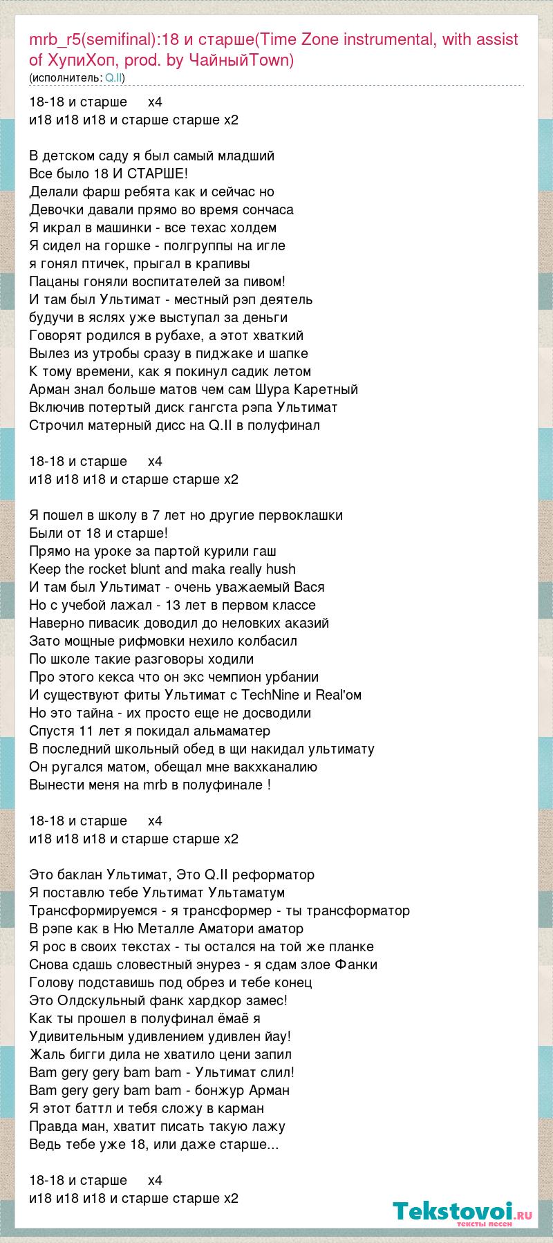 18-18 и старше х4 и18 и18 и18 и старше старше х2 В детском саду я был самый младший Все было 18 И СТАРШЕ! Делали фарш ребята как и сейчас но Девочки давали прямо во время сончаса Я икрал в машинки - все техас холдем Я сидел на горшке - полгруппы на игле я гонял птичек, прыгал в крапивы Пацаны гоняли воспитателей за пивом! И там был Ультимат - местный рэп деятель будучи в яслях уже выступал за деньги Говорят родился в рубахе, а этот хваткий Вылез из утробы сразу в пиджаке и шапке К тому времени, как я покинул садик летом Арман знал больше матов чем сам Шура Каретный Включив потертый диск гангста рэпа Ультимат Строчил матерный дисс на Q.II в полуфинал 18-18 и старше х4 и18 и18 и18 и старше старше х2 Я пошел в школу в 7 лет но другие первоклашки Были от 18 и старше! Прямо на уроке за партой курили гаш Keep the rocket blunt and maka really hush И там был Ультимат - очень уважаемый Вася Но с учебой лажал - 13 лет в первом классе Наверно пивасик доводил до неловких аказий Зато мощные рифмовки нехило колбасил По школе такие разговоры ходили Про этого кекса что он экс чемпион урбании И существуют фиты Ультимат c TechNine и Real'ом Но это тайна - их просто еще не досводили Спустя 11 лет я покидал альмаматер В последний школьный обед в щи накидал ультимату Он ругался матом, обещал мне вакхканалию Вынести меня на mrb в полуфинале ! 18-18 и старше х4 и18 и18 и18 и старше старше х2 Это баклан Ультимат, Это Q.II реформатор Я поставлю тебе Ультимат Ультаматум Трансформируемся - я трансформер - ты трансформатор В рэпе как в Ню Металле Аматори аматор Я рос в своих текстах - ты остался на той же планке Снова сдашь словестный энурез - я сдам злое Фанки Голову подставишь под обрез и тебе конец Это Олдскульный фанк хардкор замес! Как ты прошел в полуфинал ёмаё я Удивительным удивлением удивлен йау! Жаль бигги дила не хватило цени запил Bam gery gery bam bam - Ультимат слил! Bam gery gery bam bam - бонжур Арман Я этот баттл и тебя сложу в карман Правда ман, хватит писать такую лажу Ведь тебе уже 18, или даже старше... 18-18 и старше х4 и18 и18 и18 и старше старше х2