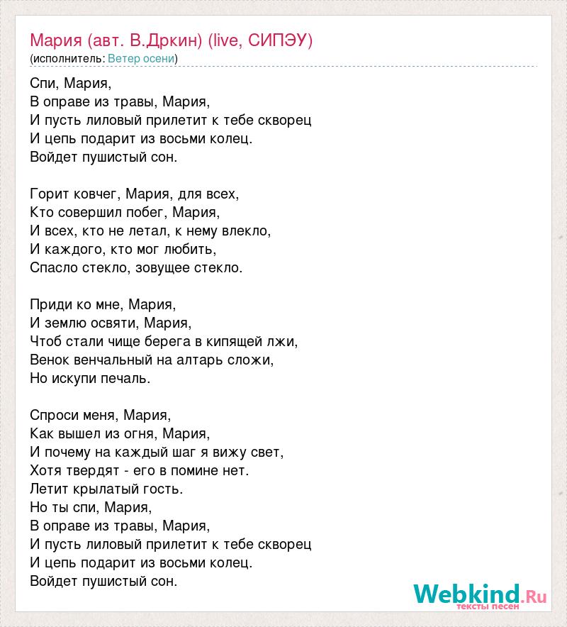 Спи, Мария, В оправе из травы, Мария, И пусть лиловый прилетит к тебе скворец И цепь подарит из восьми колец. Войдет пушистый сон. Горит ковчег, Мария, для всех, Кто совершил побег, Мария, И всех, кто не летал, к нему влекло, И каждого, кто мог любить, Спасло стекло, зовущее стекло. Приди ко мне, Мария, И землю освяти, Мария, Чтоб стали чище берега в кипящей лжи, Венок венчальный на алтарь сложи, Но искупи печаль. Спроси меня, Мария, Как вышел из огня, Мария, И почему на каждый шаг я вижу свет, Хотя твердят - его в помине нет. Летит крылатый гость. Но ты спи, Мария, В оправе из травы, Мария, И пусть лиловый прилетит к тебе скворец И цепь подарит из восьми колец. Войдет пушистый сон.