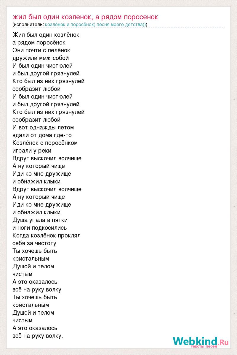Жил был один козлёнок а рядом поросёнок Они почти с пелёнок дружили меж собой И был один чистюлей и был другой грязнулей Кто был из них грязнулей сообразит любой И был один чистюлей и был другой грязнулей Кто был из них грязнулей сообразит любой И вот однажды летом вдали от дома где-то Козлёнок с поросёнком играли у реки Вдруг выскочил волчище А ну который чище Иди ко мне дружище и обнажил клыки Вдруг выскочил волчище А ну который чище Иди ко мне дружище и обнажил клыки Душа упала в пятки и ноги подкосились Когда козлёнок проклял себя за чистоту Ты хочешь быть кристальным Душой и телом чистым А это оказалось всё на руку волку Ты хочешь быть кристальным Душой и телом чистым А это оказалось всё на руку волку.