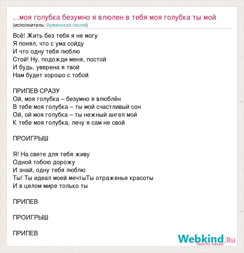 Всё! Жить без тебя я не могу Я понял, что с ума сойду И что одну тебя люблю Стой! Ну, подожди меня, постой И будь, уверена я твой Нам будет хорошо с тобой ПРИПЕВ СРАЗУ Ой, моя голубка – безумно я влюблён В тебя моя голубка – ты мой счастливый сон Ой, ой моя голубка – ты нежный ангел мой К тебе моя голубка, лечу я сам не свой ПРОИГРЫШ Я! На свете для тебя живу Одной тобою дорожу И знай, одну тебя люблю Ты! Ты идеал моей мечтыТы отраженье красоты И в целом мире только ты ПРИПЕВ ПРОИГРЫШ ПРИПЕВ