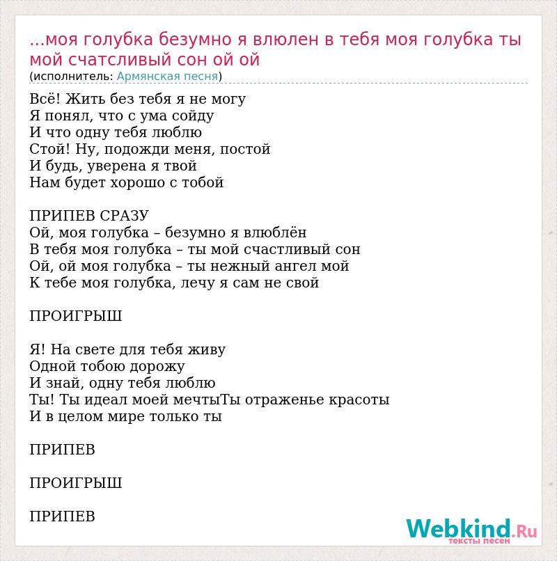 Всё! Жить без тебя я не могу Я понял, что с ума сойду И что одну тебя люблю Стой! Ну, подожди меня, постой И будь, уверена я твой Нам будет хорошо с тобой ПРИПЕВ СРАЗУ Ой, моя голубка – безумно я влюблён В тебя моя голубка – ты мой счастливый сон Ой, ой моя голубка – ты нежный ангел мой К тебе моя голубка, лечу я сам не свой ПРОИГРЫШ Я! На свете для тебя живу Одной тобою дорожу И знай, одну тебя люблю Ты! Ты идеал моей мечтыТы отраженье красоты И в целом мире только ты ПРИПЕВ ПРОИГРЫШ ПРИПЕВ