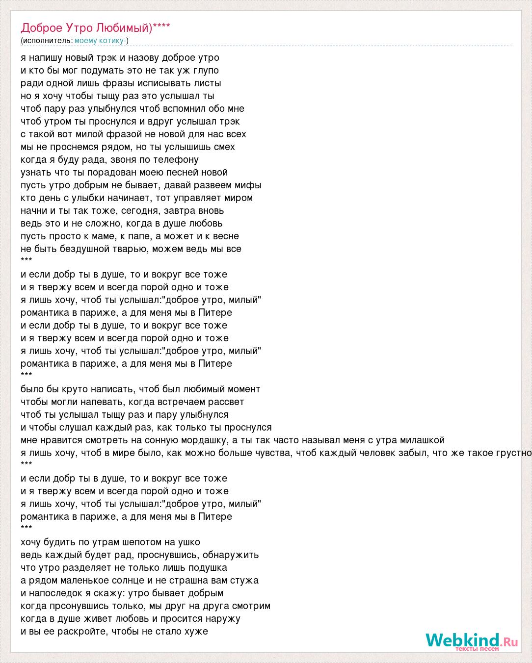 я напишу новый трэк и назову доброе утро и кто бы мог подумать это не так уж глупо ради одной лишь фразы исписывать листы но я хочу чтобы тыщу раз это услышал ты чтоб пару раз улыбнулся чтоб вспомнил обо мне чтоб утром ты проснулся и вдруг услышал трэк с такой вот милой фразой не новой для нас всех мы не проснемся рядом, но ты услышишь смех когда я буду рада, звоня по телефону узнать что ты порадован моею песней новой пусть утро добрым не бывает, давай развеем мифы кто день с улыбки начинает, тот управляет миром начни и ты так тоже, сегодня, завтра вновь ведь это и не сложно, когда в душе любовь пусть просто к маме, к папе, а может и к весне не быть бездушной тварью, можем ведь мы все *** и если добр ты в душе, то и вокруг все тоже и я твержу всем и всегда порой одно и тоже я лишь хочу, чтоб ты услышал:"доброе утро, милый" романтика в париже, а для меня мы в Питере и если добр ты в душе, то и вокруг все тоже и я твержу всем и всегда порой одно и тоже я лишь хочу, чтоб ты услышал:"доброе утро, милый" романтика в париже, а для меня мы в Питере *** было бы круто написать, чтоб был любимый момент чтобы могли напевать, когда встречаем рассвет чтоб ты услышал тыщу раз и пару улыбнулся и чтобы слушал каждый раз, как только ты проснулся мне нравится смотреть на сонную мордашку, а ты так часто называл меня с утра милашкой я лишь хочу, чтоб в мире было, как можно больше чувства, чтоб каждый человек забыл, что же такое грустно *** и если добр ты в душе, то и вокруг все тоже и я твержу всем и всегда порой одно и тоже я лишь хочу, чтоб ты услышал:"доброе утро, милый" романтика в париже, а для меня мы в Питере *** хочу будить по утрам шепотом на ушко ведь каждый будет рад, проснувшись, обнаружить что утро разделяет не только лишь подушка а рядом маленькое солнце и не страшна вам стужа и напоследок я скажу: утро бывает добрым когда прсонувшись только, мы друг на друга смотрим когда в душе живет любовь и просится наружу и вы ее раскройте, чтобы не стало хуже