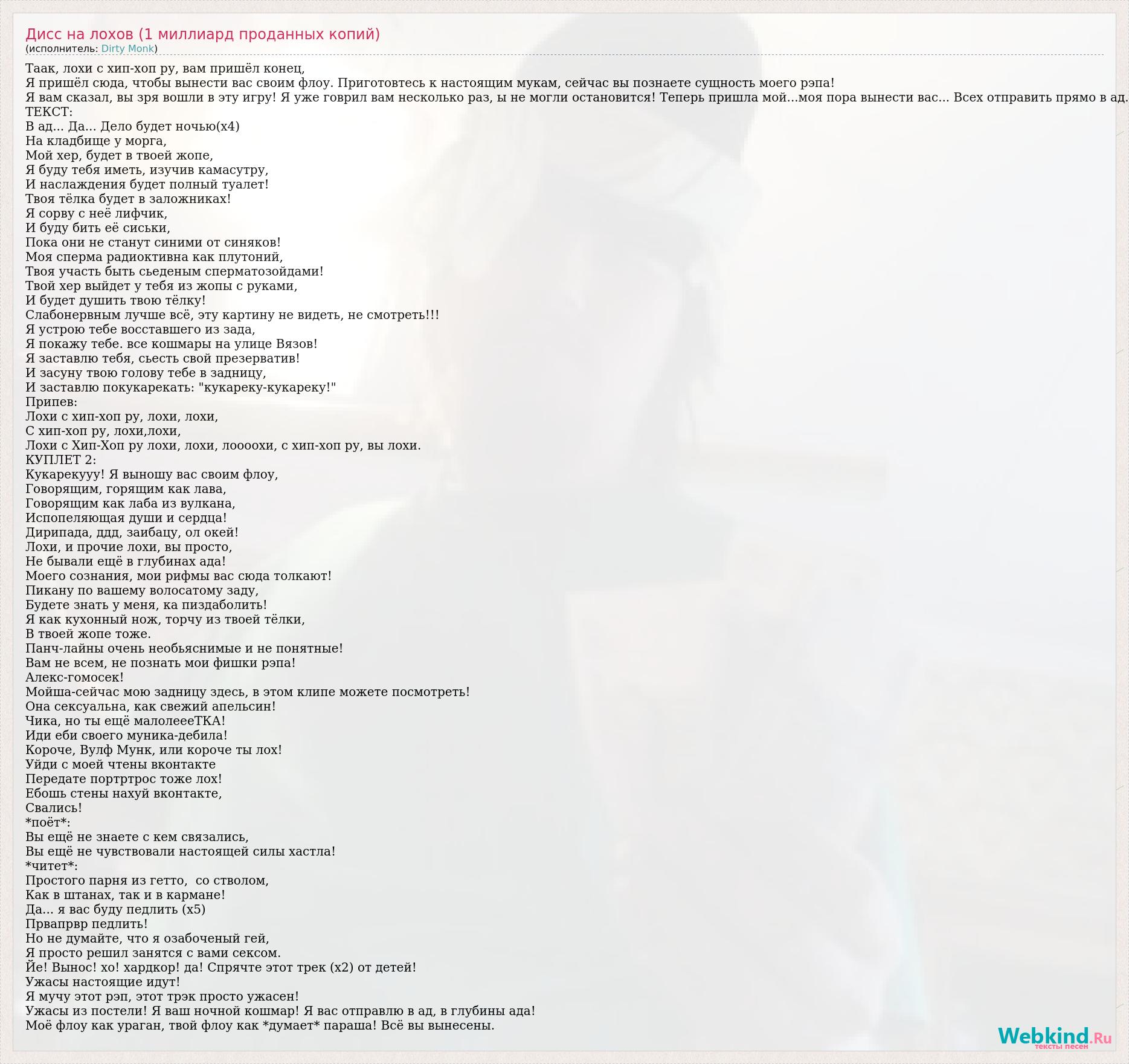 Таак, лохи с хип-хоп ру, вам пришёл конец, Я пришёл сюда, чтобы вынести вас своим флоу. Приготовтесь к настоящим мукам, сейчас вы познаете сущность моего рэпа! Я вам сказал, вы зря вошли в эту игру! Я уже говрил вам несколько раз, ы не могли остановится! Теперь пришла мой...моя пора вынести вас... Всех отправить прямо в ад. ТЕКСТ: В ад... Да... Дело будет ночью(х4) На кладбище у морга, Мой хер, будет в твоей жопе, Я буду тебя иметь, изучив камасутру, И наслаждения будет полный туалет! Твоя тёлка будет в заложниках! Я сорву с неё лифчик, И буду бить её сиськи, Пока они не станут синими от синяков! Моя сперма радиоктивна как плутоний, Твоя участь быть сьеденым сперматозойдами! Твой хер выйдет у тебя из жопы с руками, И будет душить твою тёлку! Слабонервным лучше всё, эту картину не видеть, не смотреть!!! Я устрою тебе восставшего из зада, Я покажу тебе. все кошмары на улице Вязов! Я заставлю тебя, сьесть свой презерватив! И засуну твою голову тебе в задницу, И заставлю покукарекать: "кукареку-кукареку!" Припев: Лохи с хип-хоп ру, лохи, лохи, С хип-хоп ру, лохи,лохи, Лохи с Хип-Хоп ру лохи, лохи, лоооохи, с хип-хоп ру, вы лохи. КУПЛЕТ 2: Кукарекууу! Я выношу вас своим флоу, Говорящим, горящим как лава, Говорящим как лаба из вулкана, Испопеляющая души и сердца! Дирипада, ддд, заибацу, ол окей! Лохи, и прочие лохи, вы просто, Не бывали ещё в глубинах ада! Моего сознания, мои рифмы вас сюда толкают! Пикану по вашему волосатому заду, Будете знать у меня, ка пиздаболить! Я как кухонный нож, торчу из твоей тёлки, В твоей жопе тоже. Панч-лайны очень необьяснимые и не понятные! Вам не всем, не познать мои фишки рэпа! Алекс-гомосек! Мойша-сейчас мою задницу здесь, в этом клипе можете посмотреть! Она сексуальна, как свежий апельсин! Чика, но ты ещё малолеееТКА! Иди еби своего муника-дебила! Короче, Вулф Мунк, или короче ты лох! Уйди с моей чтены вконтакте Передате портртрос тоже лох! Ебошь стены нахуй вконтакте, Свались! *поёт*: Вы ещё не знаете с кем связались, Вы ещё не чувствовали настоящей силы хастла! *читет*: Простого парня из гетто, со стволом, Как в штанах, так и в кармане! Да... я вас буду педлить (х5) Првапрвр педлить! Но не думайте, что я озабоченый гей, Я просто решил занятся с вами сексом. Йе! Вынос! хо! хардкор! да! Спрячте этот трек (х2) от детей! Ужасы настоящие идут! Я мучу этот рэп, этот трэк просто ужасен! Ужасы из постели! Я ваш ночной кошмар! Я вас отправлю в ад, в глубины ада! Моё флоу как ураган, твой флоу как *думает* параша! Всё вы вынесены.